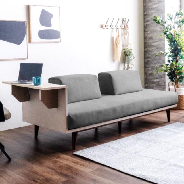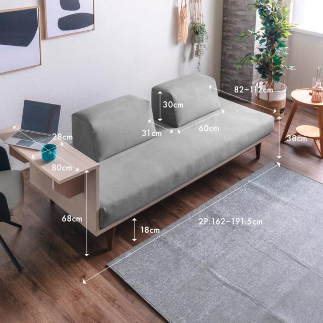 折りたたみ式のサイドテーブルが付いた2人掛けソファです。アイランドソファやソファベッドとしても使用できます。様々なスタイルでくつろぎをお楽しみいただけます。