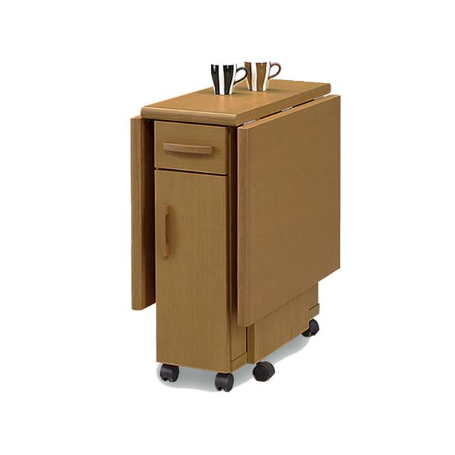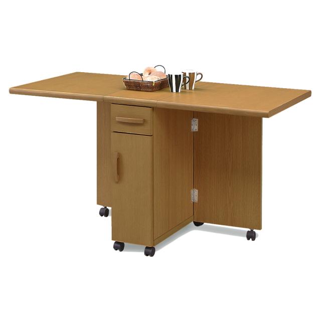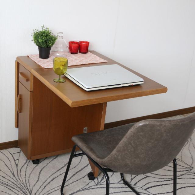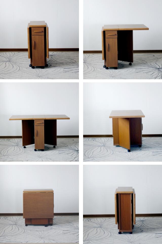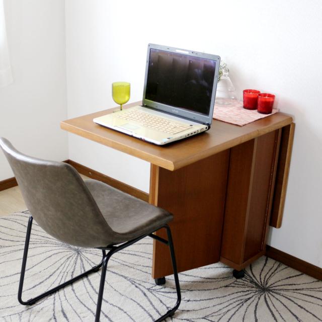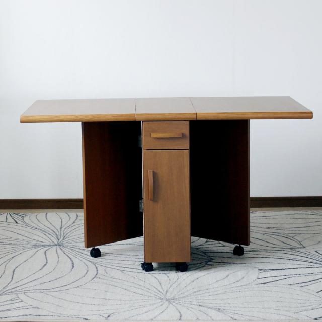 生活シーンに合わせて形を変えられるキャスター付きのテーブルです。広く使いたい場合には両側を開き、一人作業や狭いスペースでは片側の天板のみを広げてお使いただけます。天板を畳んだり広げたりする事で、生活の様々なシーンに合わせて多様な使い方ができます。