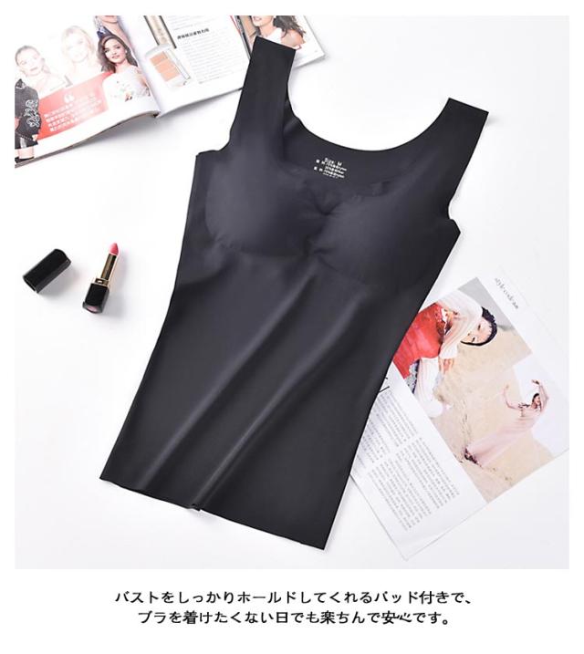 | 24時間着用可能です!一年中快適にご着用いただけるタンクトップです。 接触冷感素材なのでひんやりと気持ちよく、蒸れ感が減軽し、べタつかず、着心地抜群な一枚です。 高弾性生地で伸縮性が優れた、程よいフィット感で、快適なキャミソール着心地が実現します。 肩紐はしっかり太め、安定感のある幅広の肩紐で、チラッともみせない安心設計です。 ネックライン、袖口、裾はカットオフにすることで、下着のラインがひびきにくくなってすっきり着られて肌あたりもなめらかです。 バストをしっかりホールドしてくれるパッド付きで、ブラを着けたくない日でも楽ちんで安心です。 | |