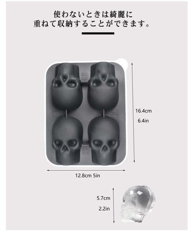 | ハロウィン、パーティーなど幅広いシーンで活躍する骸骨アイストレーです。 底の部分が柔らかくなっていて押し込みやすいです。 蓋付きなので重ねて使うことができます。 蓋は柔らかく開けやすいです。防臭の効果もあります。 氷のサイズは小さすぎず大きすぎず、ちょうどいいサイズ感です。 使わないときは綺麗に重ねて収納することができます。 | |