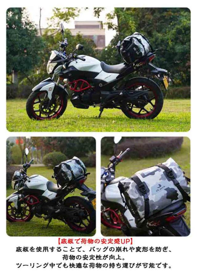 | 66L大容量のツーリングバッグ。 【ヘルメットもラクラク収納!】ワイドな入れ口が特徴のツーリングバッグ。ヘルメットもすっぽりと収めることができ、荷物の収納力が抜群です。 【ロールトップで気密性バツグン】ロールトップ式の閉じ口はしっかりとした気密性を提供。中の荷物をしっかりと保護し、安全に持ち運びできます。 【底板で荷物の安定感UP】底板を使用することで、バッグの崩れや変形を防ぎ、荷物の安定性が向上。ツーリング中でも快適な荷物の持ち運びが可能です。 【急な雨にも対応!】防水仕様のツーリングバッグなので、急な雨天や突然の雨でも心配なし。大切な荷物を安心して持ち運びできます。 【IPX7級の高い防水性能】IPX7級の防水性能を誇り、悪天候にもしっかりと対応。バッグ内の荷物をしっかりと保護します。 【高強度500D PVCナイロン採用】耐久性と強度に優れた高強度500D PVCナイロン素材。頑丈な作りで、ツーリング中の様々な状況に対応します。 【66Lサイズ】(約)63*33cmと大容量な66Lサイズ。長期ツーリングや大量の荷物を持ち運ぶ際にピッタリなサイズ感です。 【シンプルなデザインがおしゃれ】シンプルで洗練されたデザインが特徴。バイクのスタイルを損なわず、おしゃれな雰囲気を演出します。 | |