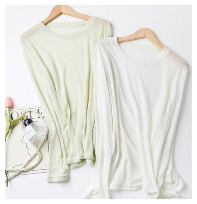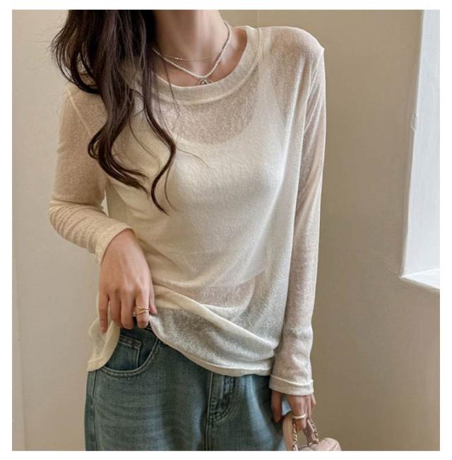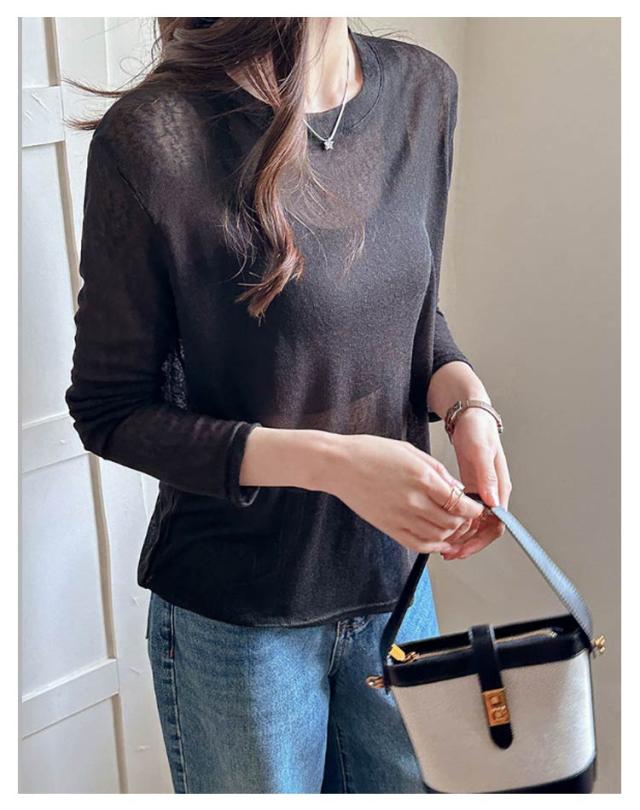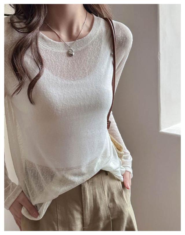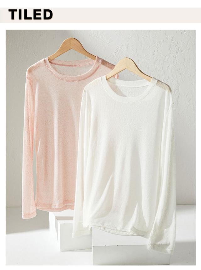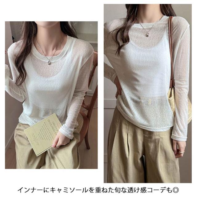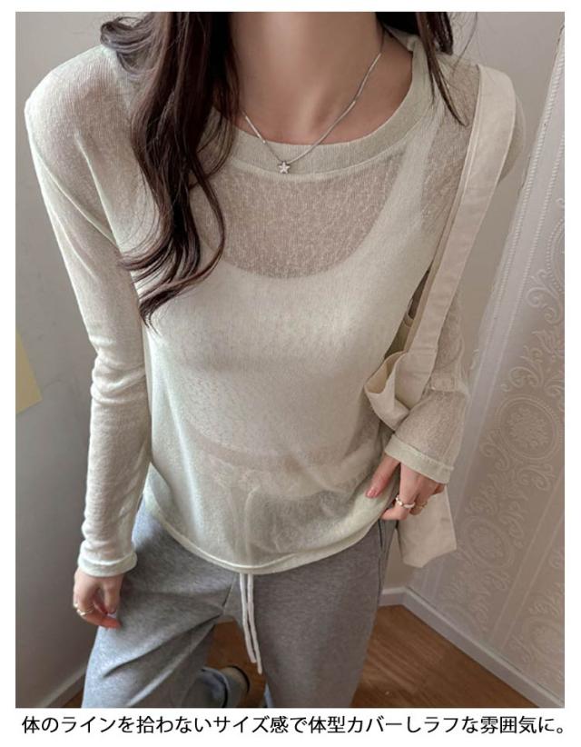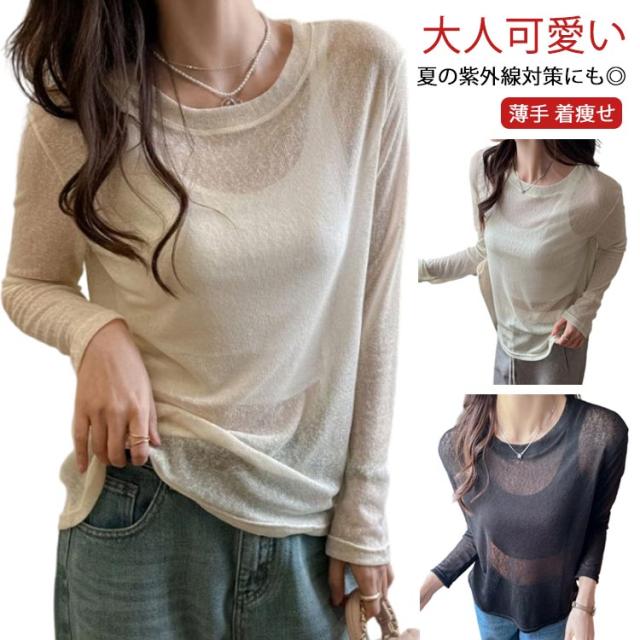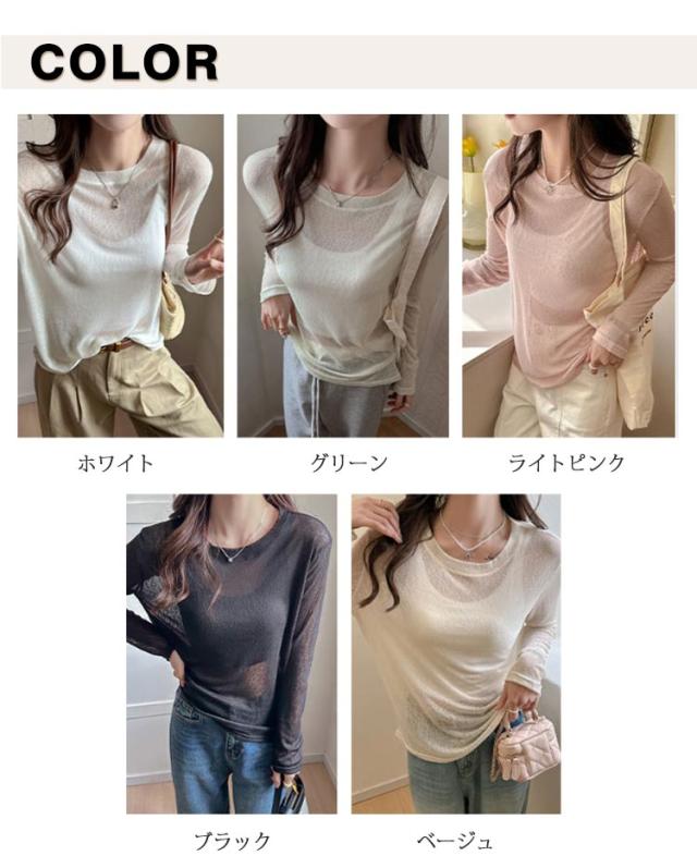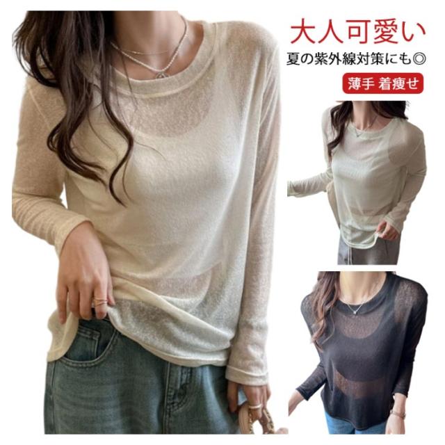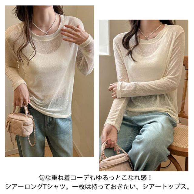 シアートップス トップス 春 シアートップス Tシャツ レイヤード ロングTシャツ 夏 重ね着 長袖 無地 カットソー ロンt tシャツ ロンT シアー クルーネック シースルー インナー 薄手 着痩せ おしゃれ きれいめ 大人可愛い UV対策 紫外線対策 透け感 大きいサイズ
