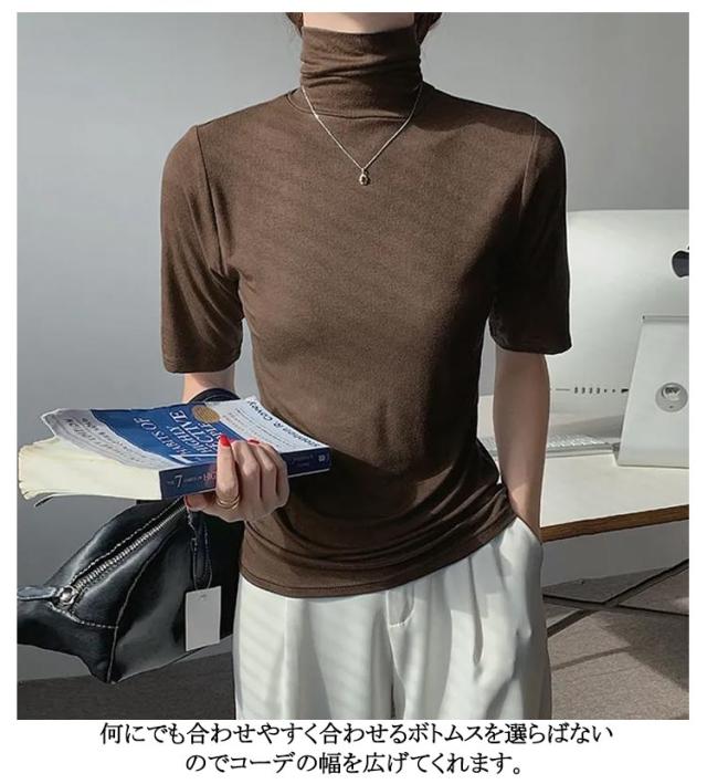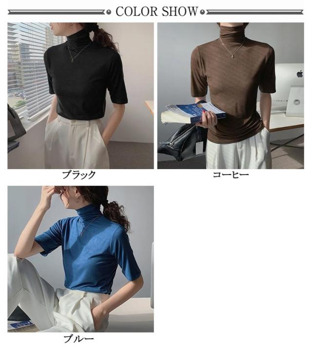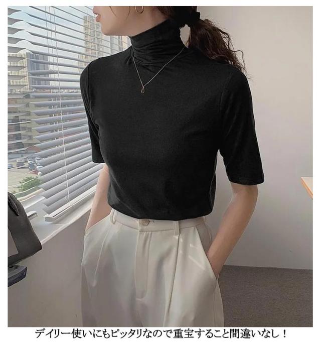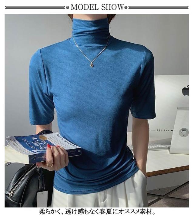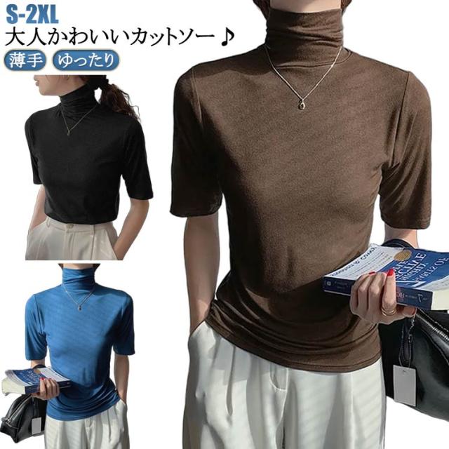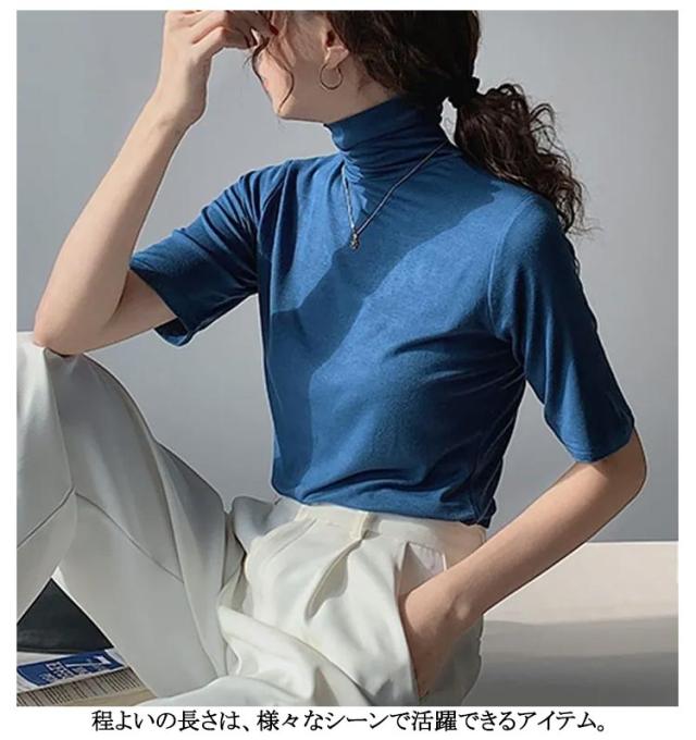 半袖Tシャツ 夏 トップス ハイネック カットソー 薄手 送料無料 30代 タートルネック タートルネック ゆったり レディース シンプル 五分袖 フィット スリム 大きいサイズ 20代 無地 40代 OL ブラック ブルー