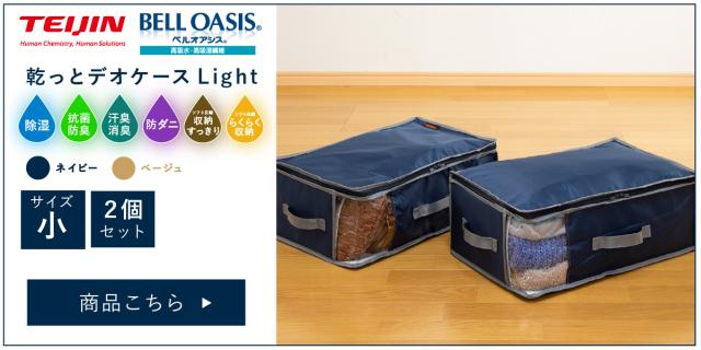 「乾っとデオケース Light」は、繊維のプロ・帝人が開発した、高機能収納ケースです。 日本製の特許技術素材「ベルオアシス」を使用し、収納中の湿気・ニオイ・菌・ダニといった見えない脅威から衣類を守ります。クローゼットや押し入れ、ベッド下など、どんな場所でも活躍。お気に入りの衣類や大切な寝具を、清潔に、やさしく保管できます。