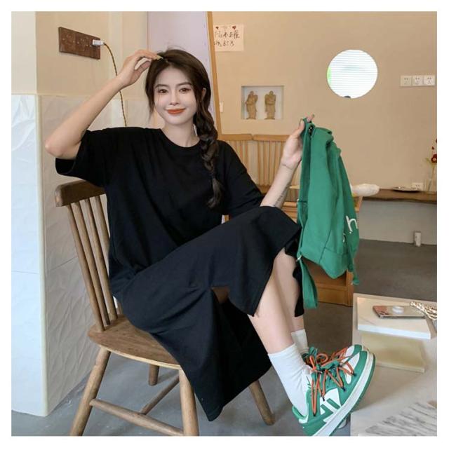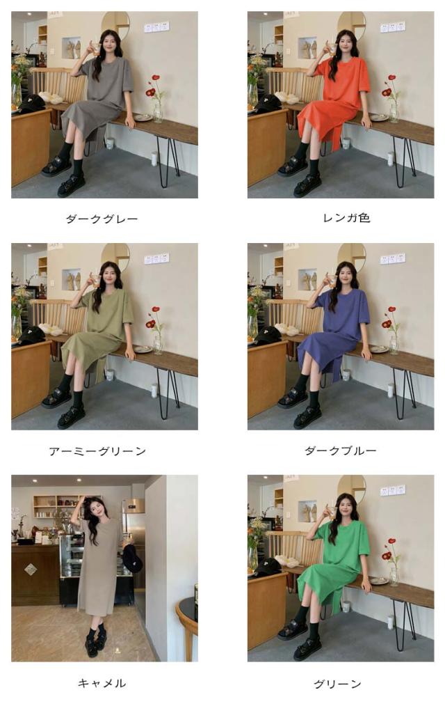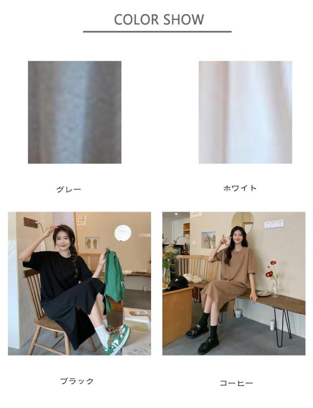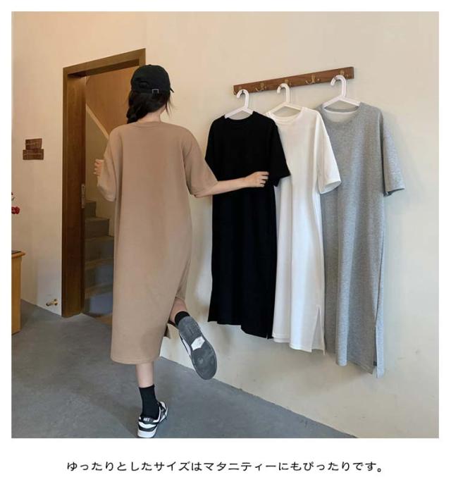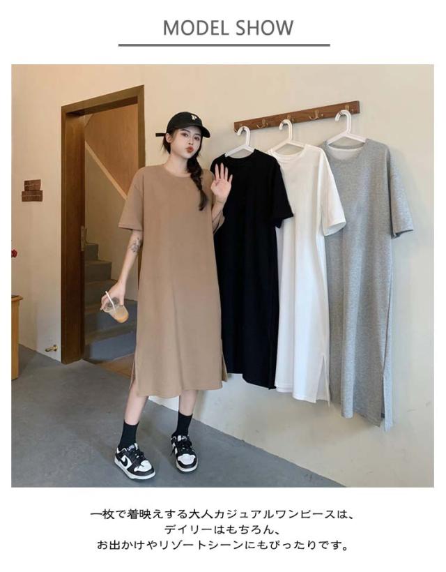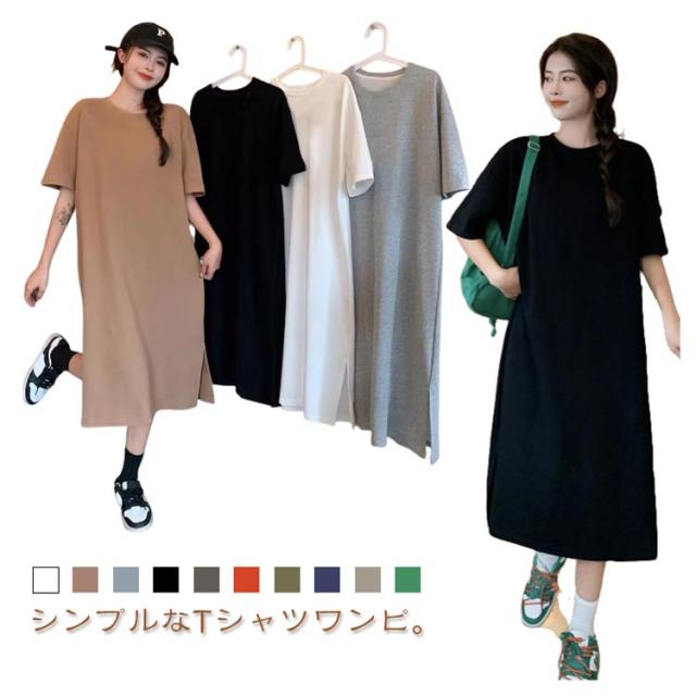ワンピース 美ライン ワンピース 夏服 半袖 スプリット マキシ丈ワンピース Tシャツワンピ クルーネック 大きいサイズ サイドスリット入り ゆったり 無地 カジュアル 体型カバー おしゃれ レディースファッション