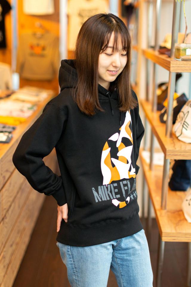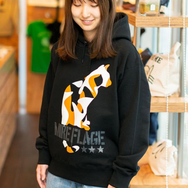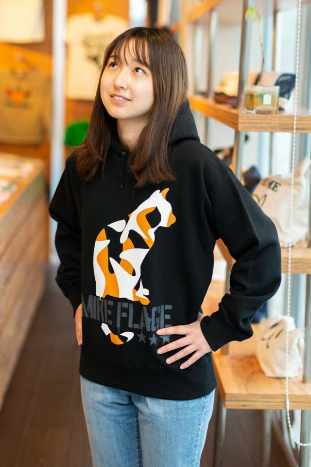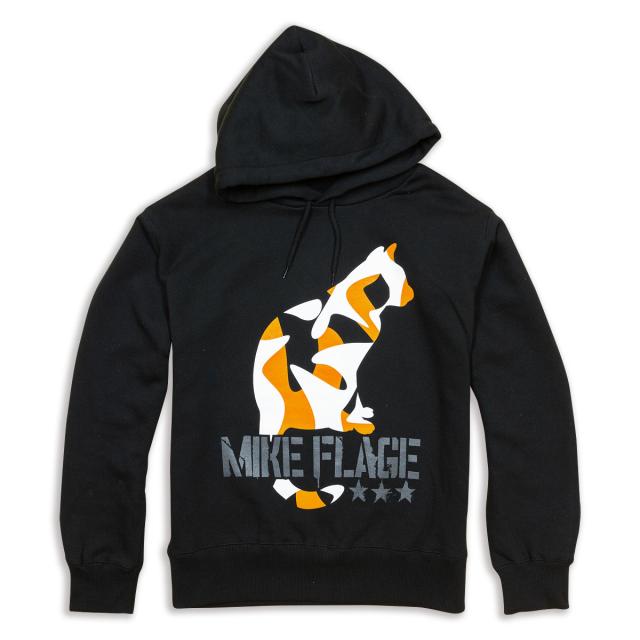 | ■ MIKE-FLAGE (ブラック) 三毛猫をカモフラージュ柄で表現した「ミケフラージュ」です。まさに都会の物陰に潜むための迷彩になりました。 カモフラ三毛猫の大きなプリントが迫力満点なパーカーです。 | |||