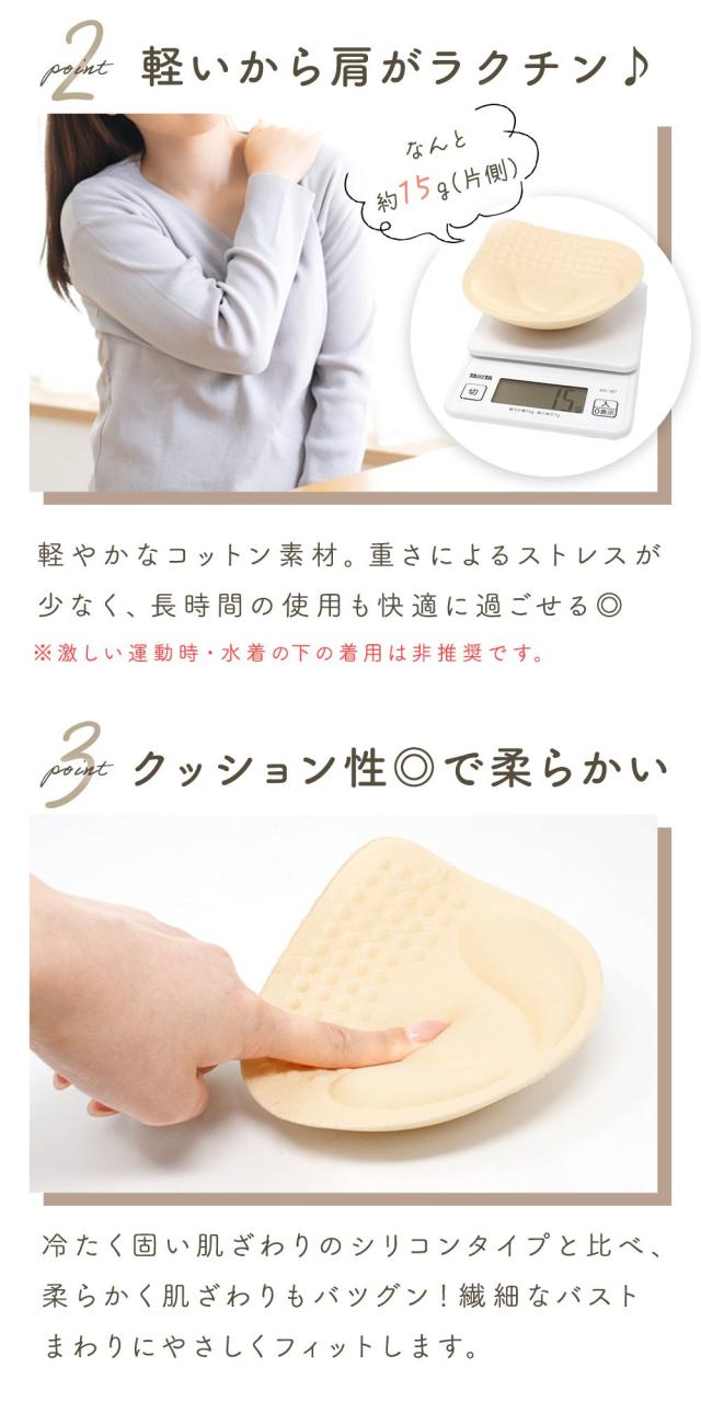 もちもちのクッションがバストにやさしくフィット。体に沿うような形状でズレにくく、安心感のある着け心地。