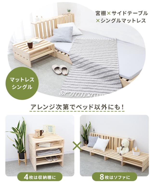 パレット構造だから、シングル・ダブル・キングサイズなどお好みのサイズにアレンジしたり、 宮棚を作ったり、自由に組み合わせて使えます。