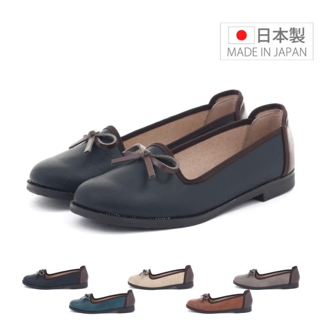 レディース パンプス フラットパンプス ローヒール ツートン リボン LADY GENOVINA レディージェノビナ 5083 幅広 3E〜4E ゆったり 低反発 歩きやすい 痛くない 日本製