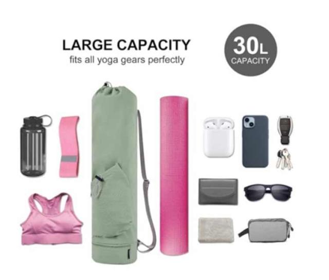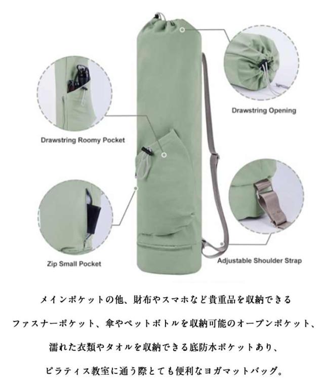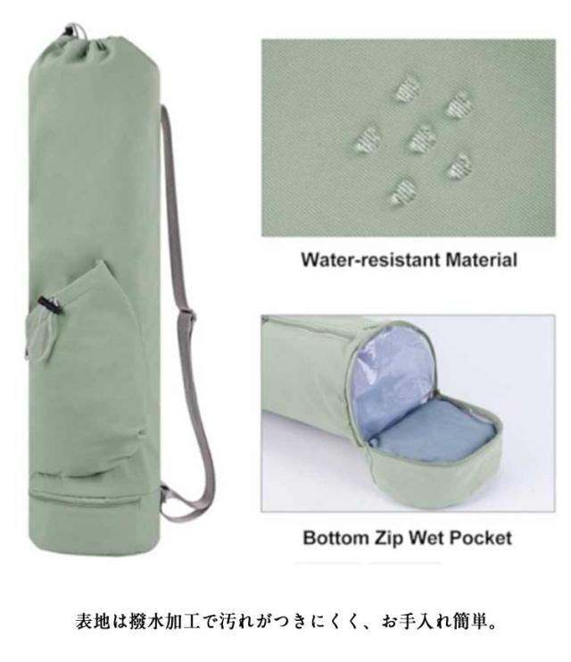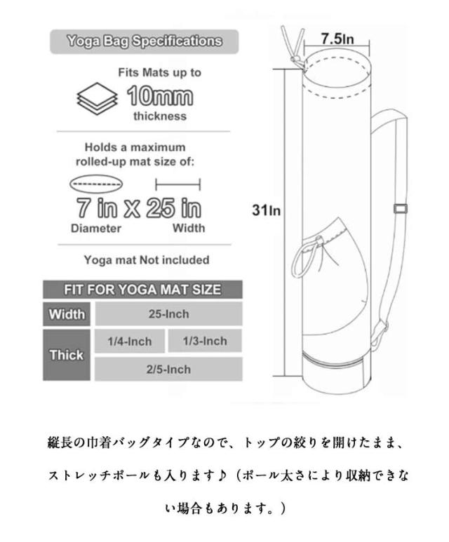 | 小物入るポケットもたくさんあり、ヨガスタジオにはこれ一つで行けるヨガマットケース。 メインポケットの他、財布やスマホなど貴重品を収納できるファスナーポケット、傘やペットボトルを収納可能のオープンポケット、濡れた衣類やタオルを収納できる底防水ポケットあり、ピラティス教室に通う際とても便利なヨガマットバッグ。 縦長の巾着バッグタイプなので、トップの絞りを開けたまま、ストレッチポールも入ります♪(ポール太さにより収納できない場合もあります。) ショルダーバッグ型で、両手がフリーで持ち運びやすいです。 表地は撥水加工で汚れがつきにくく、お手入れ簡単。 | |