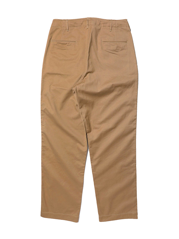 JELADO 41 Khaki Lastresort Chino Cloth ジェラード 41 カーキ ラストリゾート チノクロス 【JELADO(ジェラード)】 ヴィンテージに魅せられたすべての人へ。 「当時」を「現代」に昇華させる“URBAN VINTAGE STYLE” “AMERICAN VINTAGE”。 すなわち、「カジュアルウエア」の概念がない時代に生まれ、 19世紀末からアメリカンゴールデンエイジにかけて、名もなきデザイナーたちが生み出した現代の洋服の祖。 これらの魅力は、全てのデザイン・ディテールに意味を持つ、いわば「機能服」としての完成度であり、 それらを通して当時の文化を垣間見ることができるロマンにつきます。 一方で、これらは現代ファッションとしての視点で覗いてみると、やや時代との誤差があることも事実。 JELADOはそのギャップを埋め、ファッションとして“AMERICAN VINTAGE”を成立させるブランドです。 半世紀以上前につくられた傑作たちの根底を知り尽くしているからこそ、 常に時代性を捉えているからこそ生み出される忠実な「レプリカ」ではなく、 都会的に「リファイン」された“URBAN VINTAGE STYLE”をお楽しみください。 ラストリゾートデニムと同様に数種類のヴィンテージのM41 KHAKIの中から厳選した個体を解体し、 糸の太さ、ムラの形状、撚り回数、撚り方向など当時の生産背景、技術力を想定しながら徹底的に作り込んだ素材となります。 原綿はジェラードの基本、アメリカのディープサウスコットンを使用。 ムラの形状は強過ぎず弱過ぎず、自然なムラ糸を再現しました。 今迄の素材は反応染料で染めていましたが、この度は当時使用されていたスレン染料で染色しました。 スレン染料は現代の反応染料と比べると染料の質は落ちますが50年代頃の染料としては堅牢度、摩擦、日光に強く、 当時としてはかなり優れた染料だったので、作業着やタオルなどタフさの求められる素材に使用されていた様です。 当時の様に経年変化を楽しむことが出来る様に米綿、シャトル織機、スレン染料を使用して洗い込む度、 当時のヴィンテージを彷彿させる生地感に仕上げているのでジェラードの新41KHAKIを楽しんで頂けると思います。 原綿、糸、織り、染色、全てにこだわった究極のチノクロスそれがLASTRESORT CHINO CLOTH です。 特徴的なオフセットされたベルトループや、ヴィンテージ同様の2mm幅の両玉縁ポケットなど、再現性高く仕上げました。 通常ポケットはスレーキを使いますが、サンプリングしたヴィンテージ同様、別布のチノ生地を使用。 サイドシームのパッカリングも強く出てくるので、履いた時の無骨な印象を極太シルエットに足してくれます。 運針なども当時のピッチに合わせることでより41カーキらしいクラシックな雰囲気を表現しております。 股上も深く、ワタリも太めのヴィンテージに沿ったシルエットになっております。 | ||||||||||||||||||||||||||||||