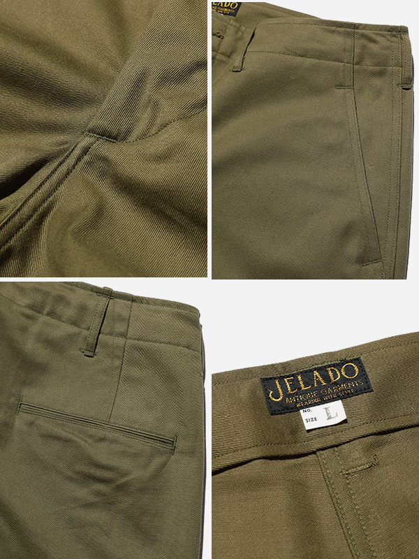 JELADO ジェラード チノパン ラストリゾート ●送料無料 ヴィンテージのM41 KHAKIの中から厳選した個体を解体し、当時の生産背景等を想定しながら徹底的に作り込んだ素材となります。
