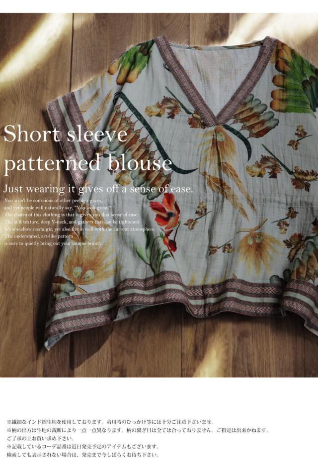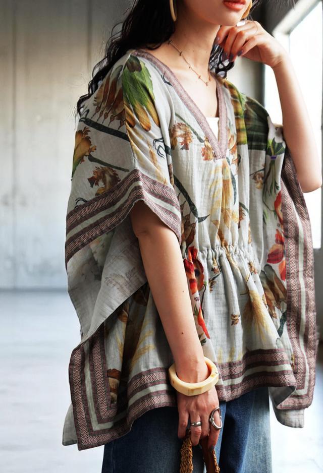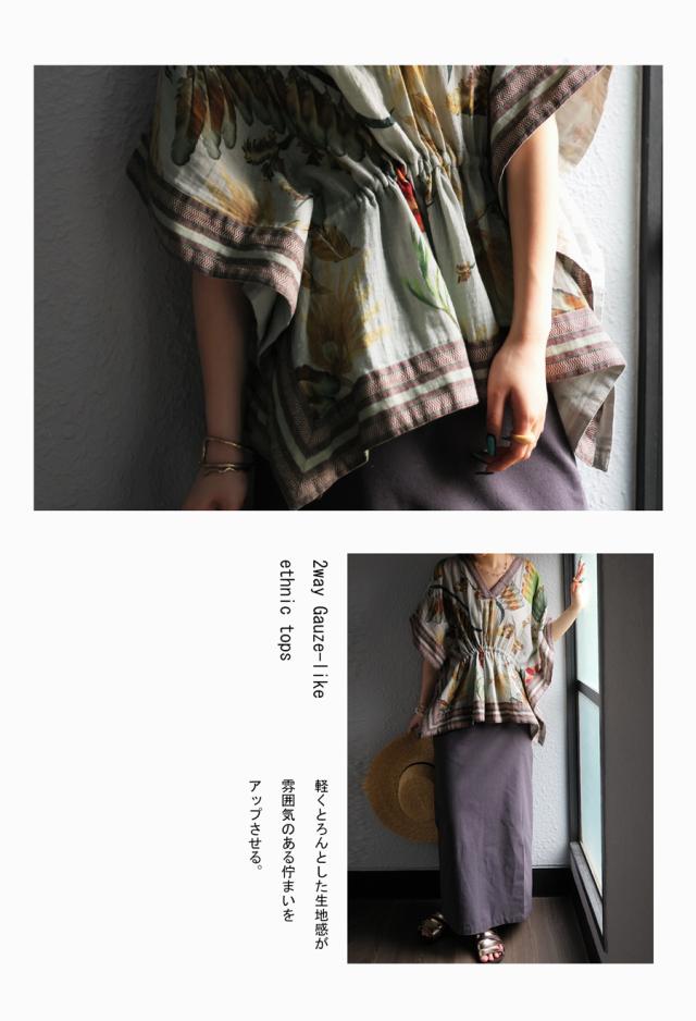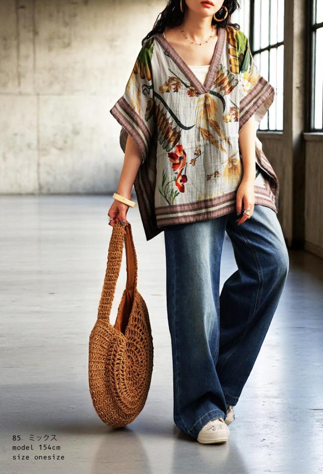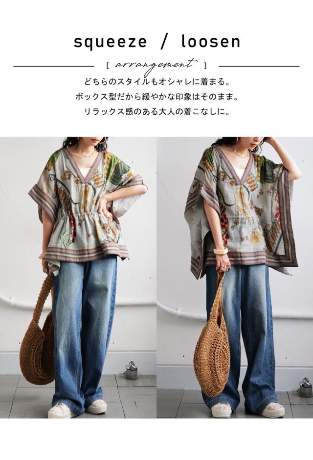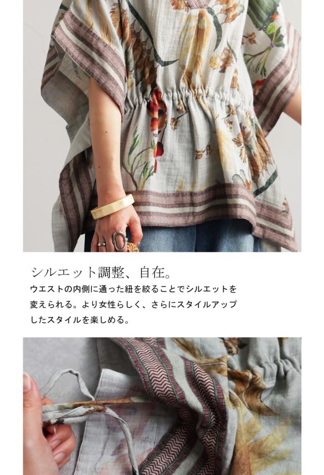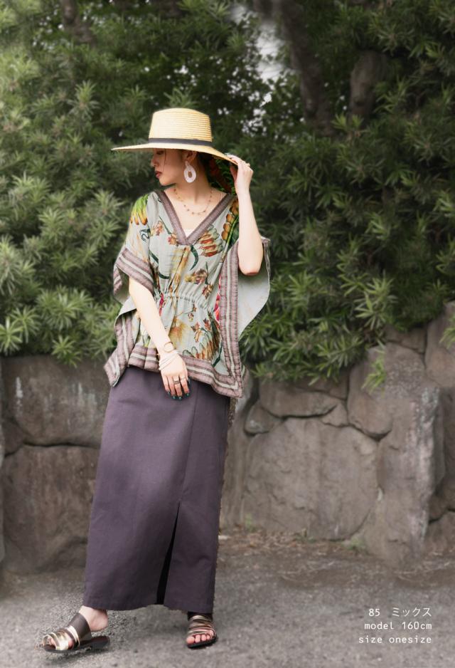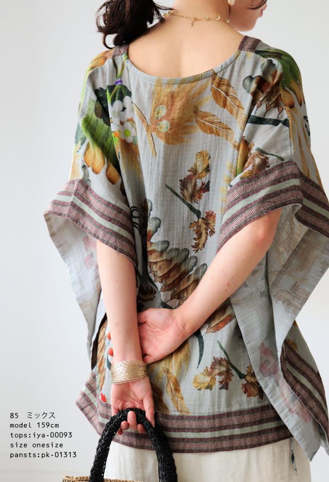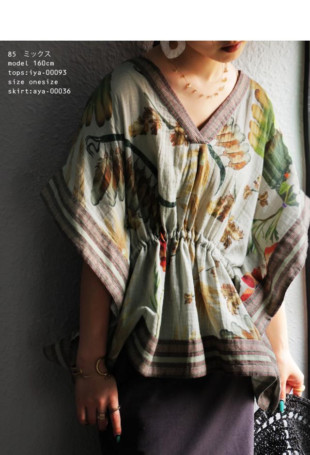 iya-00093 ブラウス ポンチョ トップス 半袖 Vネック ポンチョ風 綿100% 綿100 コトン インド綿 ガーゼ風 体型カバー シルエット調整 スタイルアップ 涼しい 春 夏