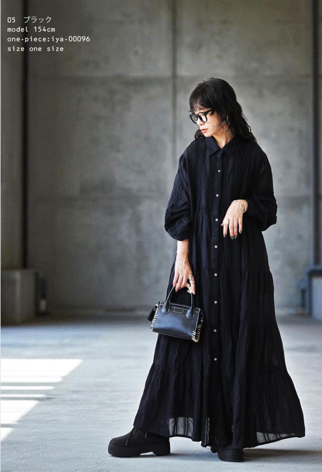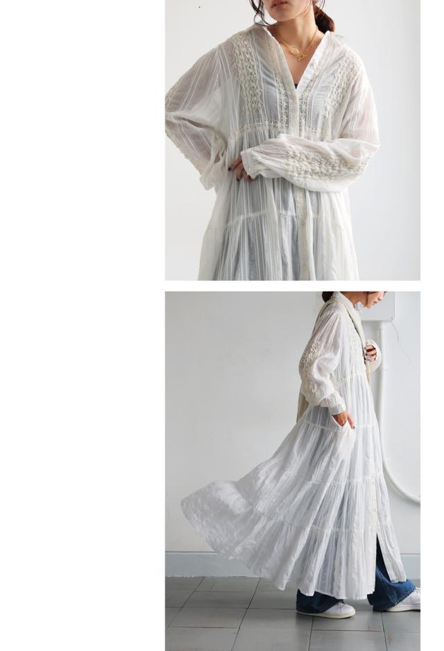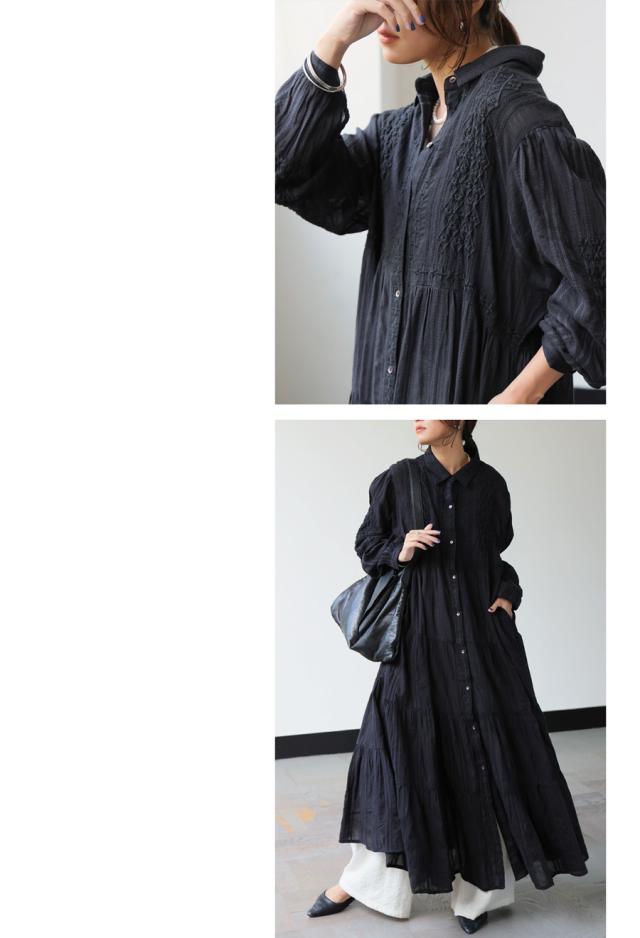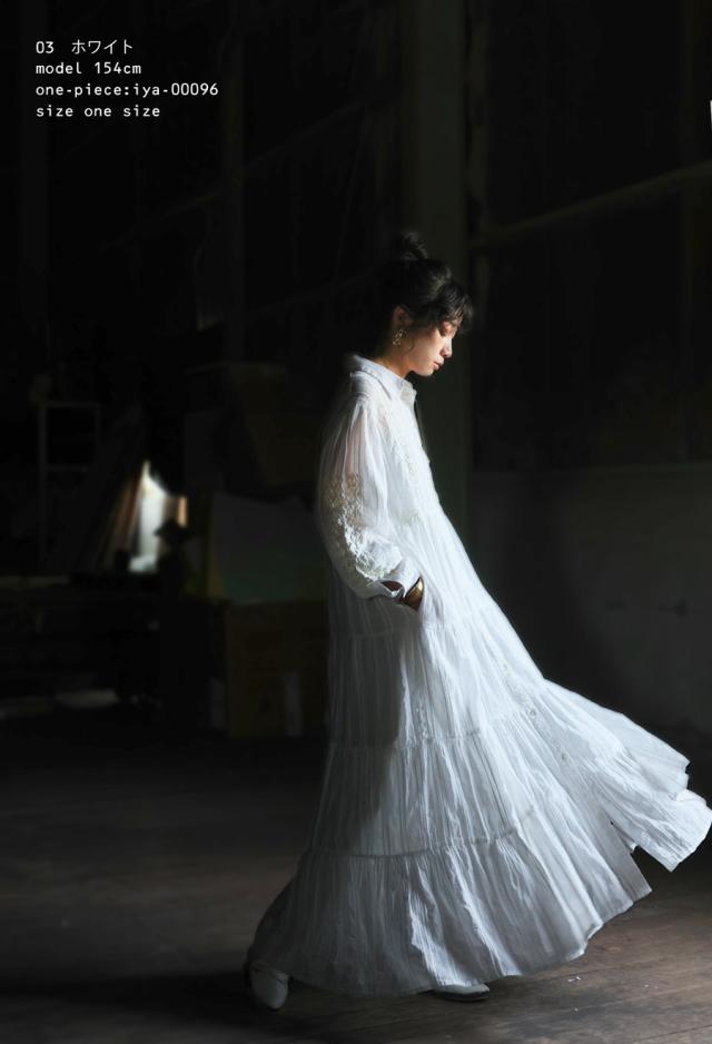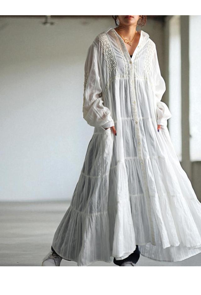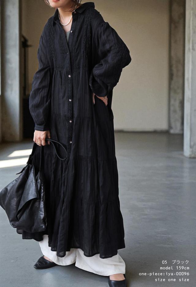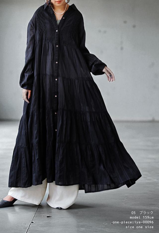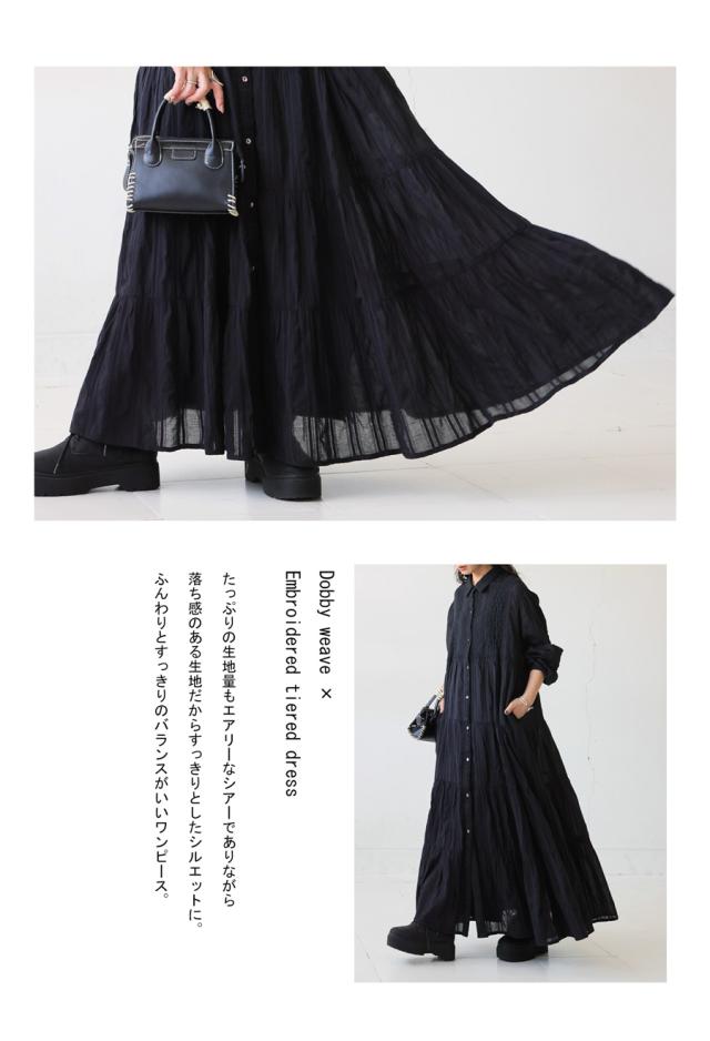 iya-00096 ワンピース シャツワンピース ロング 綿100 綿 コットン 刺繍 ドビー織り ティアード 体型カバー ゆったり 透け感 涼しい きれいめ ナチュラル 前開き 羽織り
