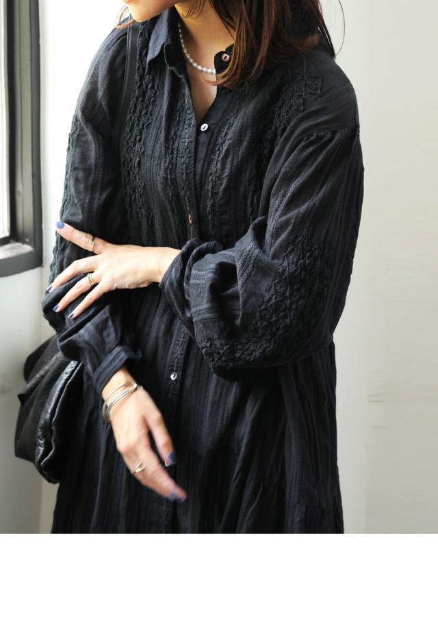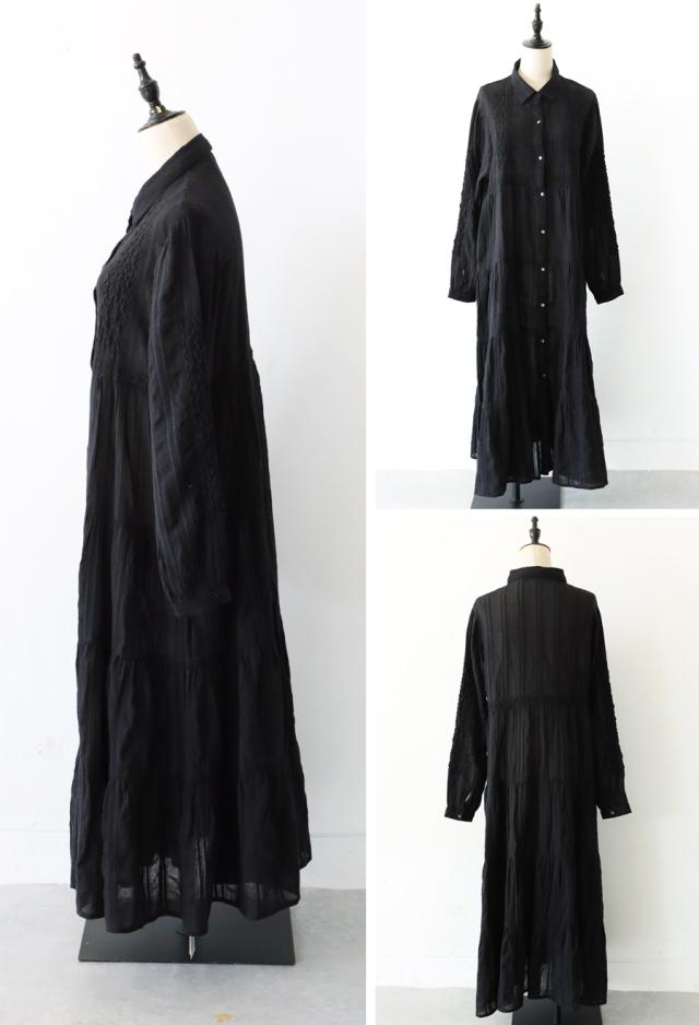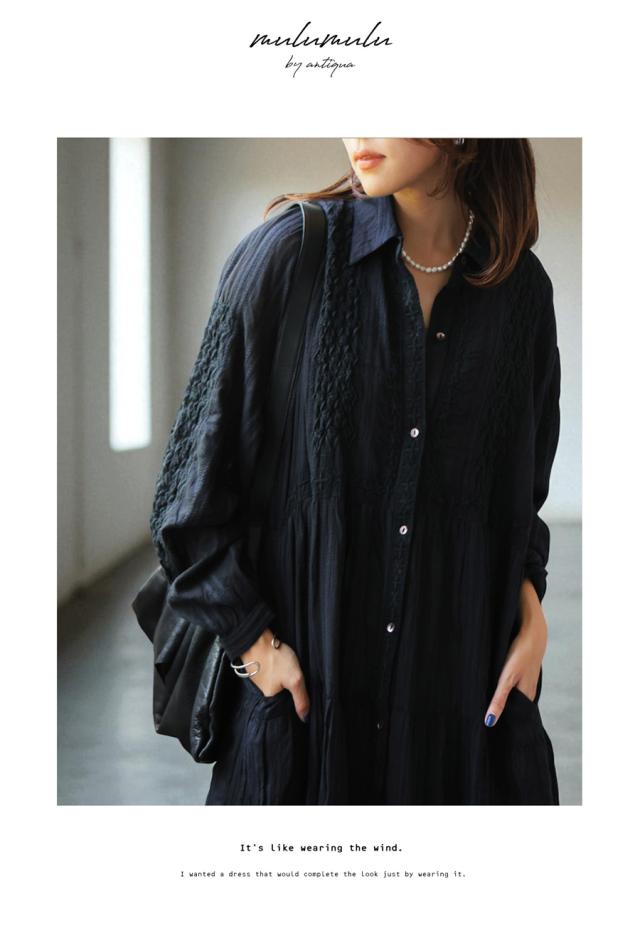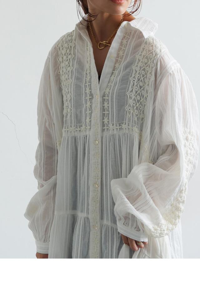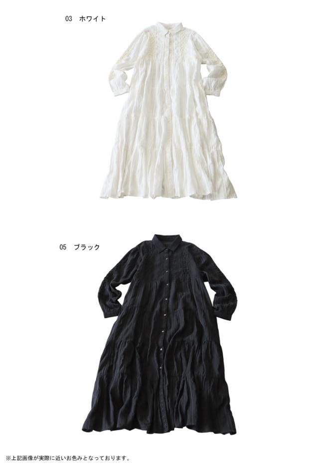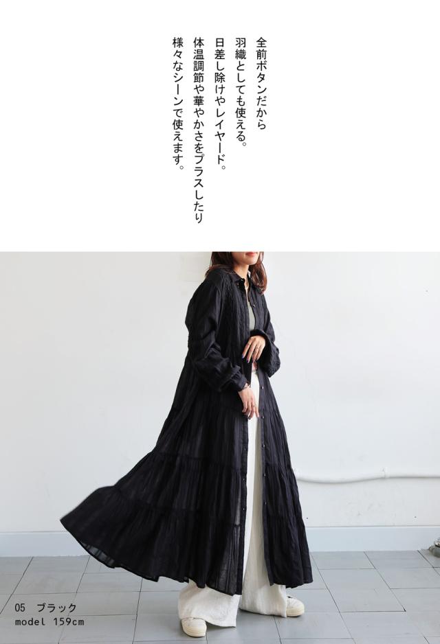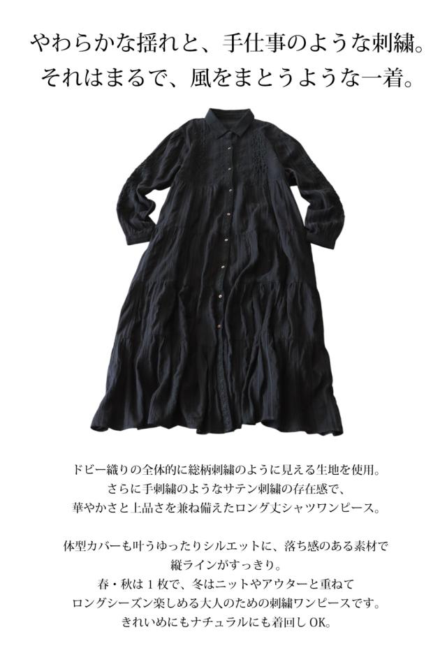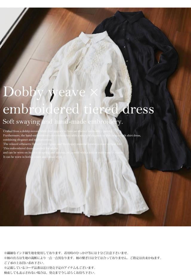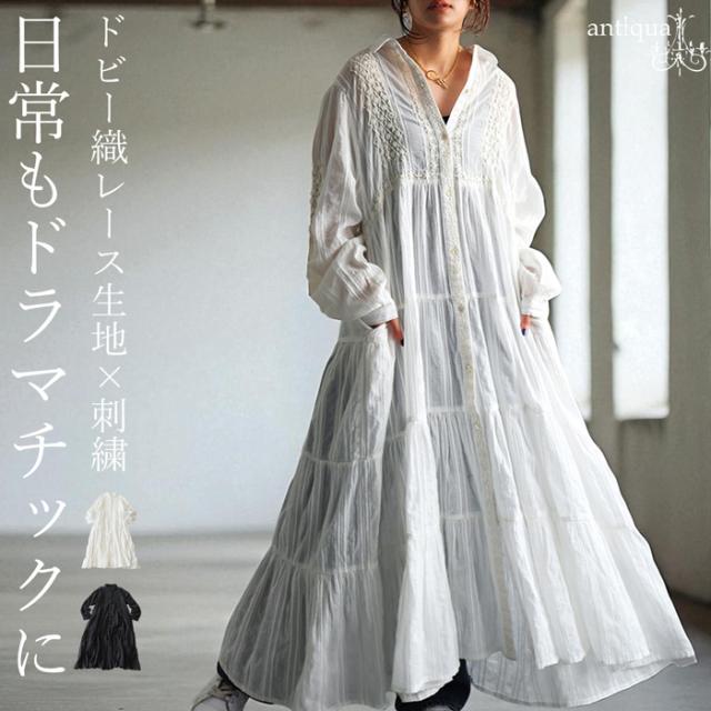 iya-00096 ワンピース シャツワンピース ロング 綿100 綿 コットン 刺繍 ドビー織り ティアード 体型カバー ゆったり 透け感 涼しい きれいめ ナチュラル 前開き 羽織り