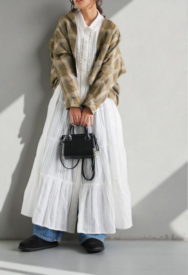 前立ては全開可能なシャツ仕様で、ワンピースとしてだけでなく羽織りとしても使える2WAYデザイン。