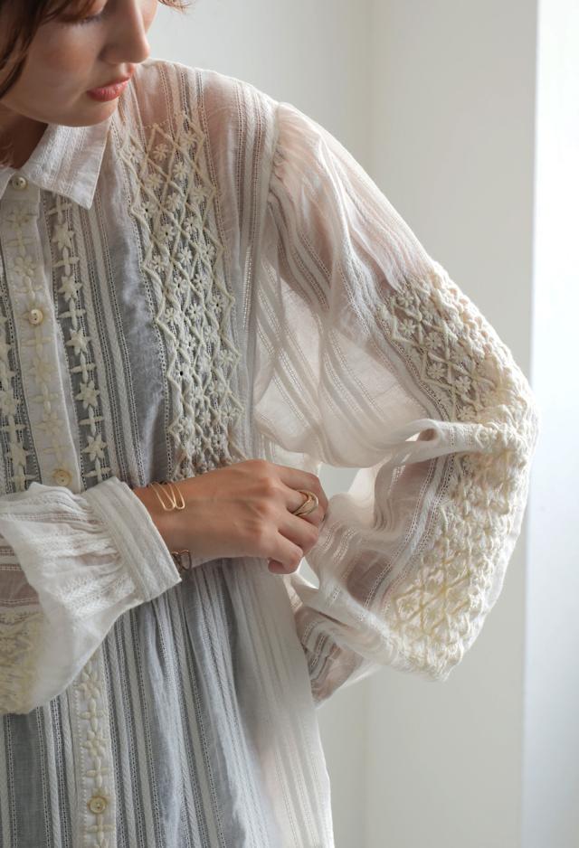 どちらも素材の繊細な凹凸感と刺繍ディテールが際立つ、ニュアンスのある表情に仕上がっています。