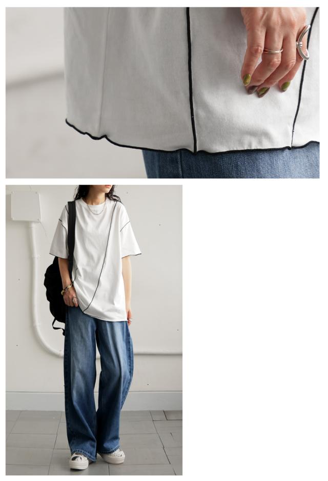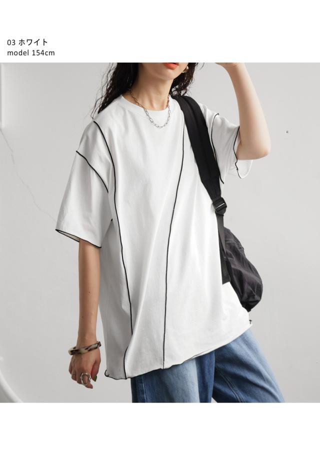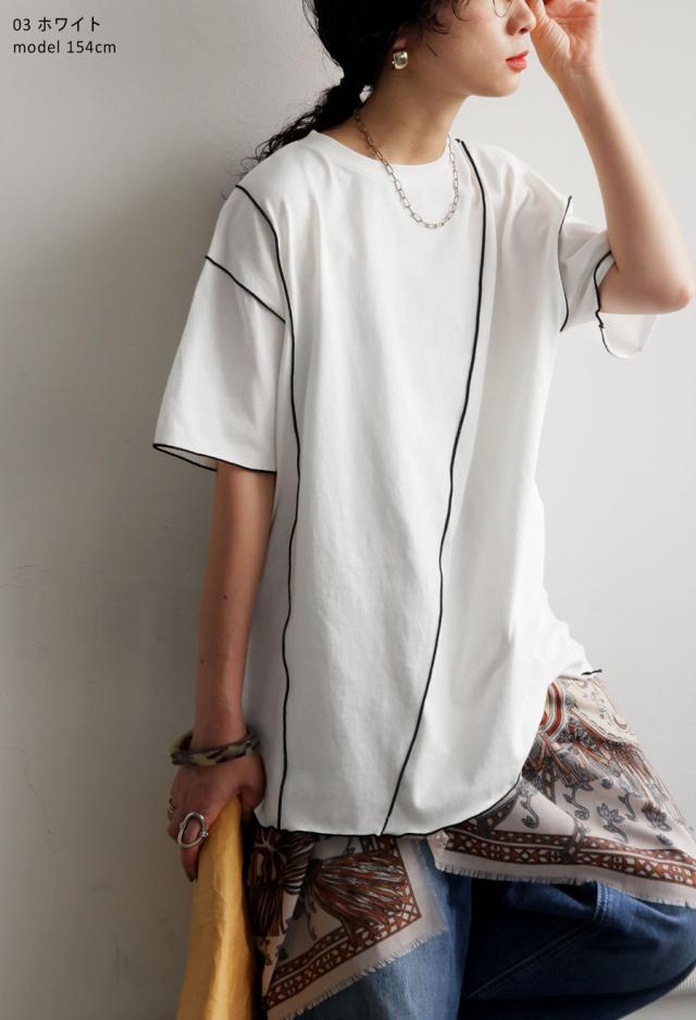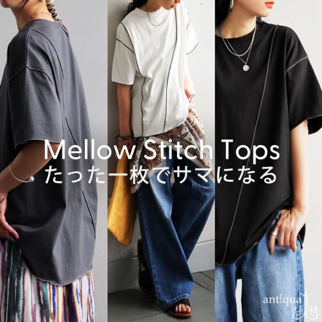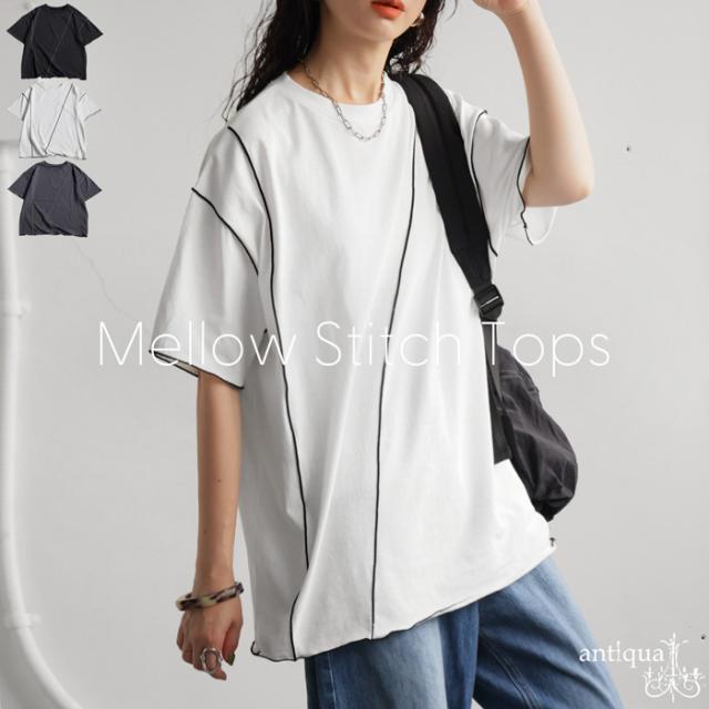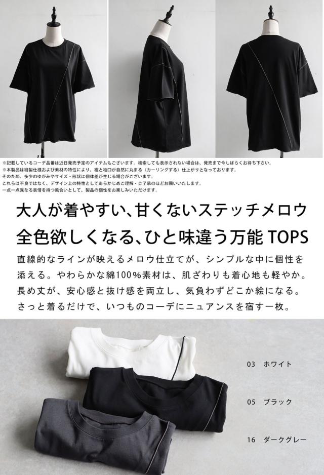 ay-00075 メロウステッチ トップス 綿100% 綿 コットン 配色 メロウ デザイン ゆったり 体型カバー お尻が隠れる 着回し 大人カジュアル 春 夏 デザインTシャツ