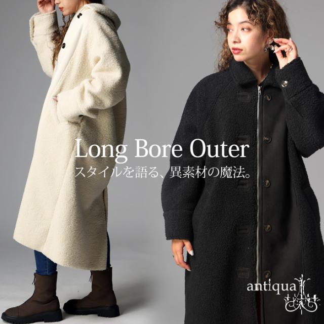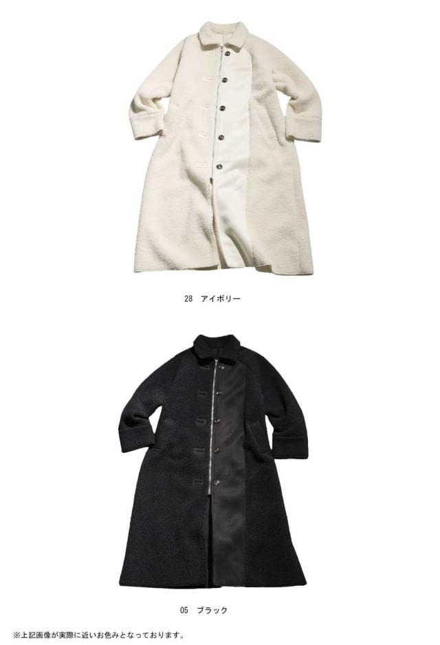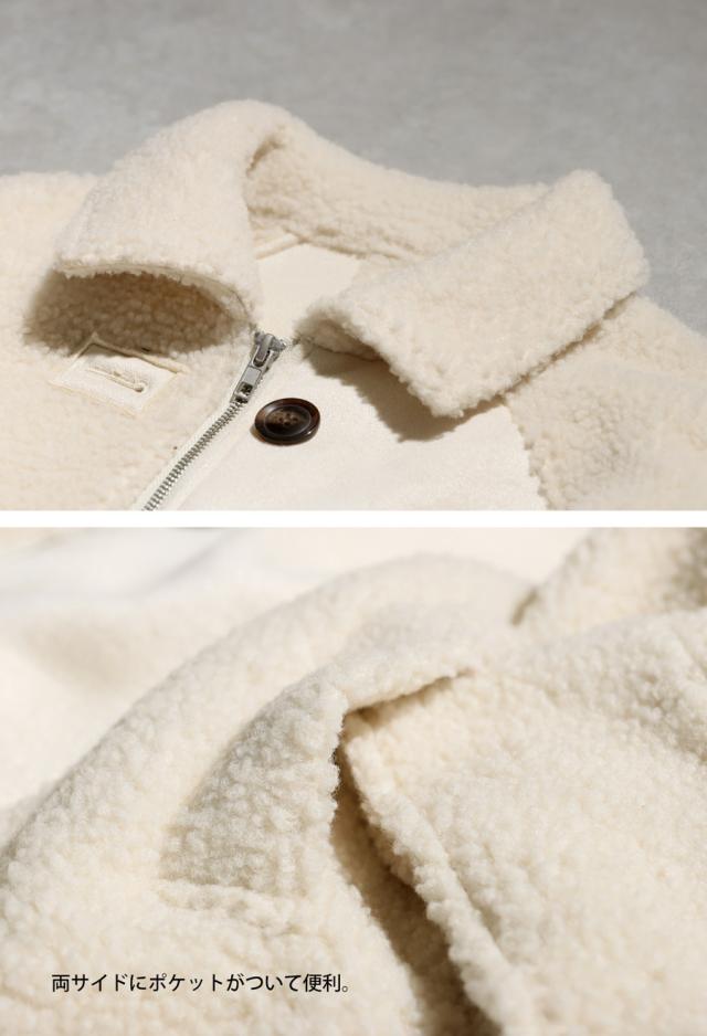 ふんわりとしたボアの表情と、しっとりとしたフェイクムートンの質感を同系色でまとめ、シンプルながらも奥行きのある一着に仕上げています。