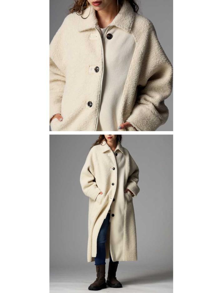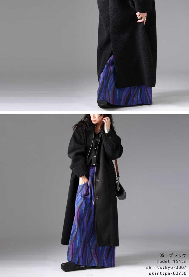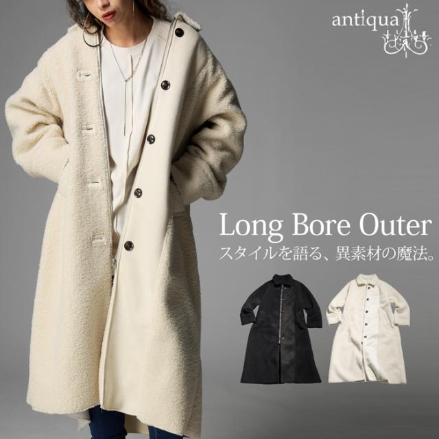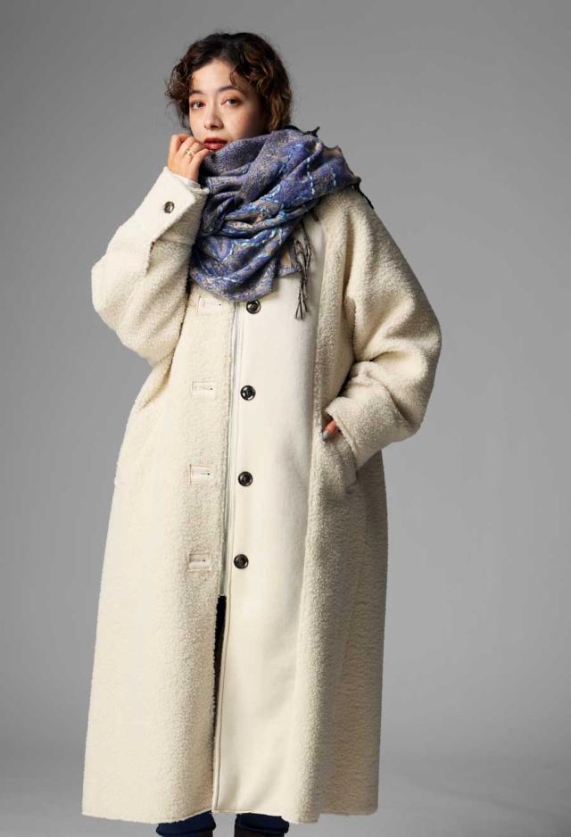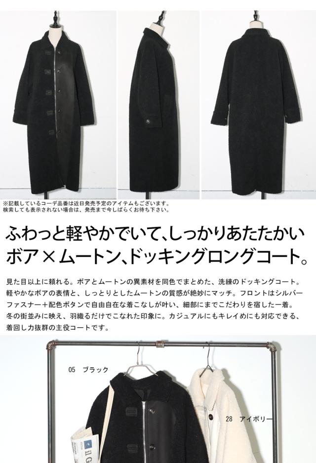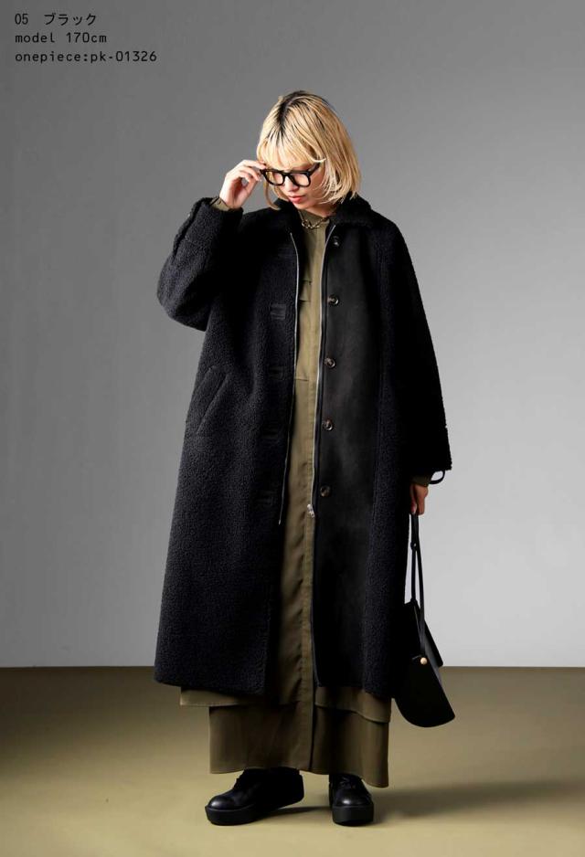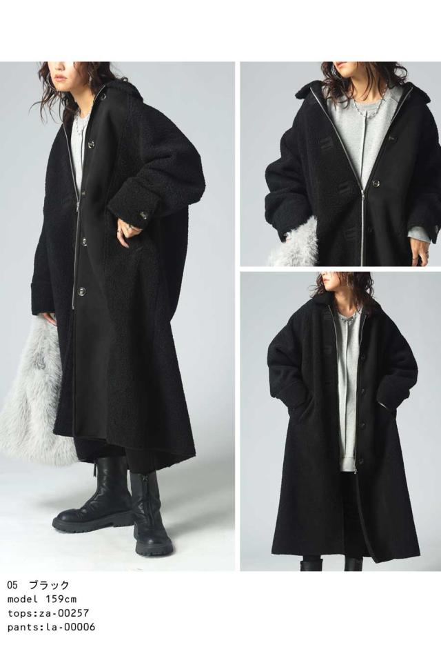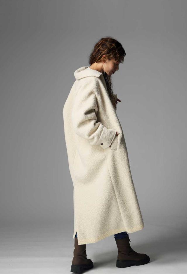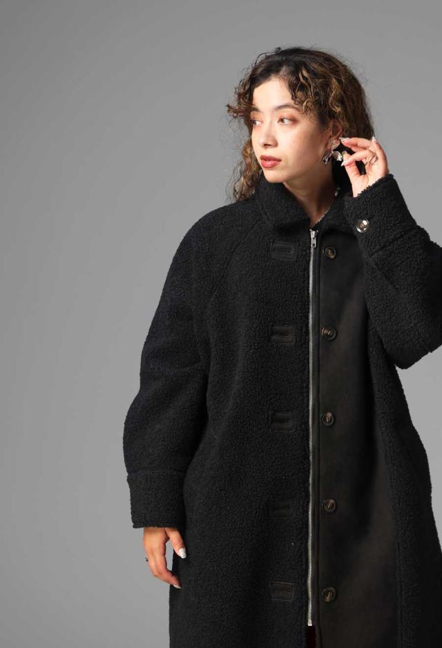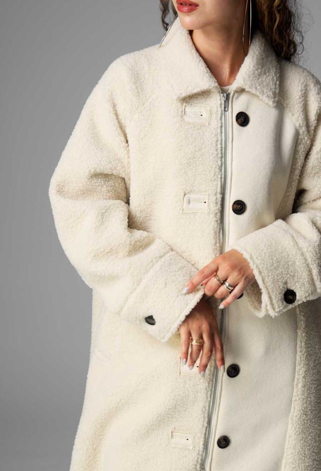 異素材の絶妙なコントラストが目を惹く、ボア×ムートンのドッキングロングコートが登場しました。