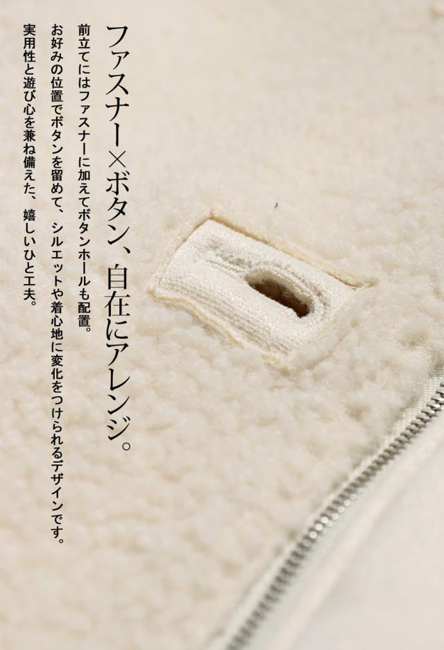 フロントはファスナーとボタンの2WAY仕様。シルエットや雰囲気を好みに合わせて調整できるデザイン性と実用性を兼ね備えています。