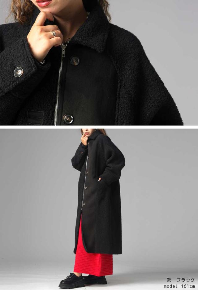 esa-00224 ボアコート アウター 異素材 ドッキング 防寒 おしゃれ 上品 カジュアル フェイクムートン ファスナー ボタン ポケット付き ゆったり ブラック アイボリー 体型カバー