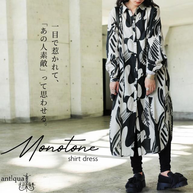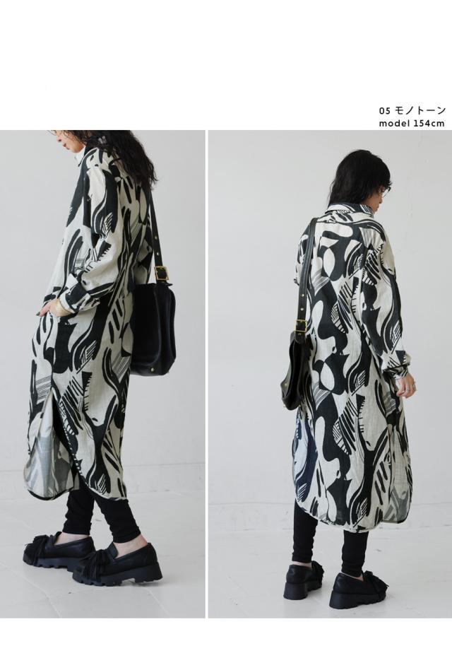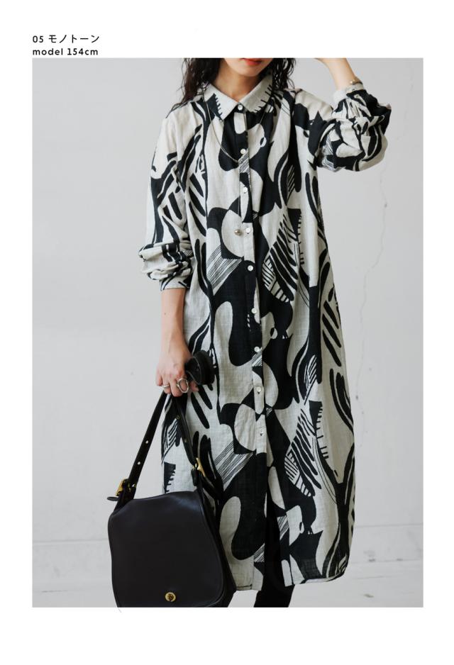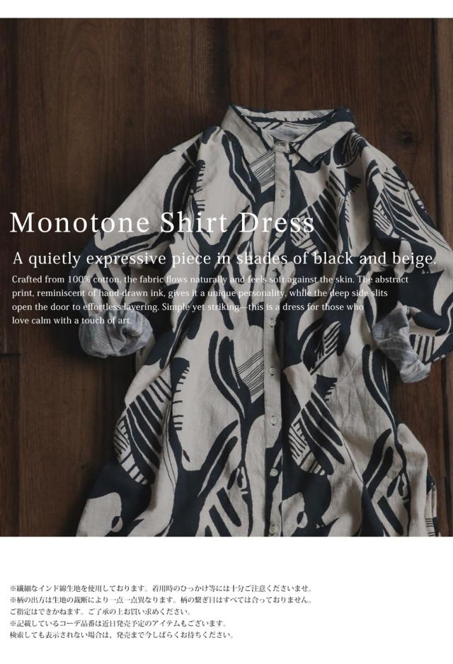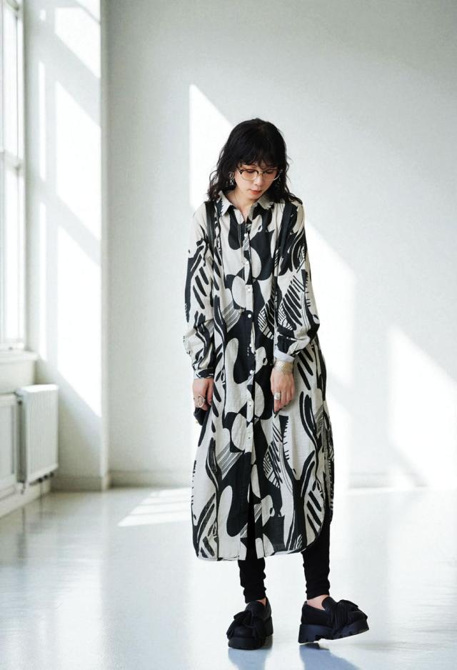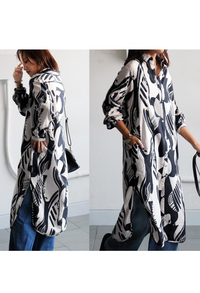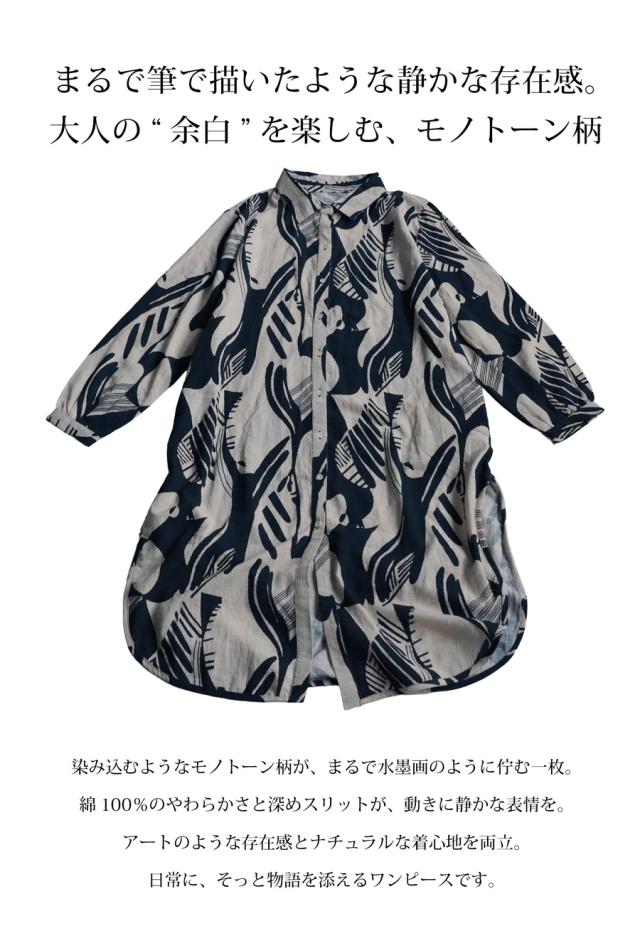 まるで筆で描いたような、静かに存在感を放つモノトーン柄が印象的なシャツワンピース。