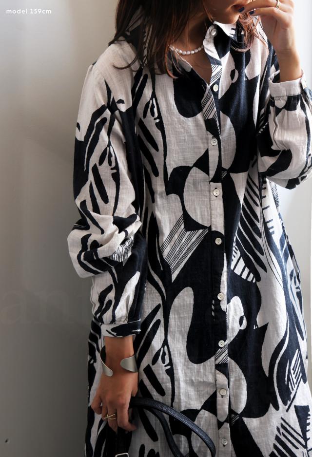 iya-00091 シャツワンピース ワンピース ワンピ 長袖 ロング 綿100 綿 コットン モノトーン デジタルプリント スリット シェルボタン アート柄 ゆったり おしゃれ 体型カバー