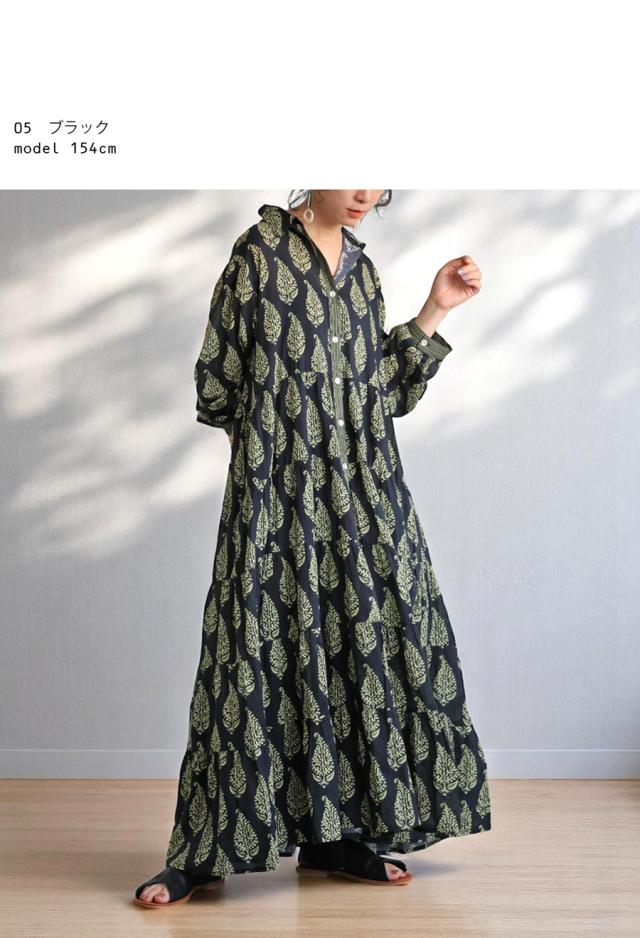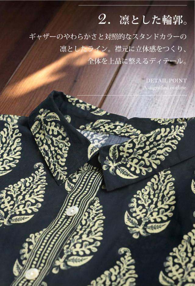 iya-00092 ワンピース シャツワンピ ロング ギャザー スタンドカラー インド綿 綿100% 綿100 コットン 体型カバー 涼しい 上品 ナチュラル 春 夏 ブラック