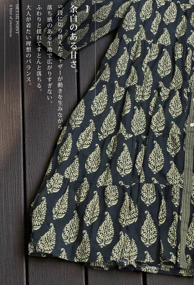 甘くなりがちなギャザーワンピースも、スタイリッシュなボタニカル柄とシャープな襟元で引き締められ、洗練された印象に。