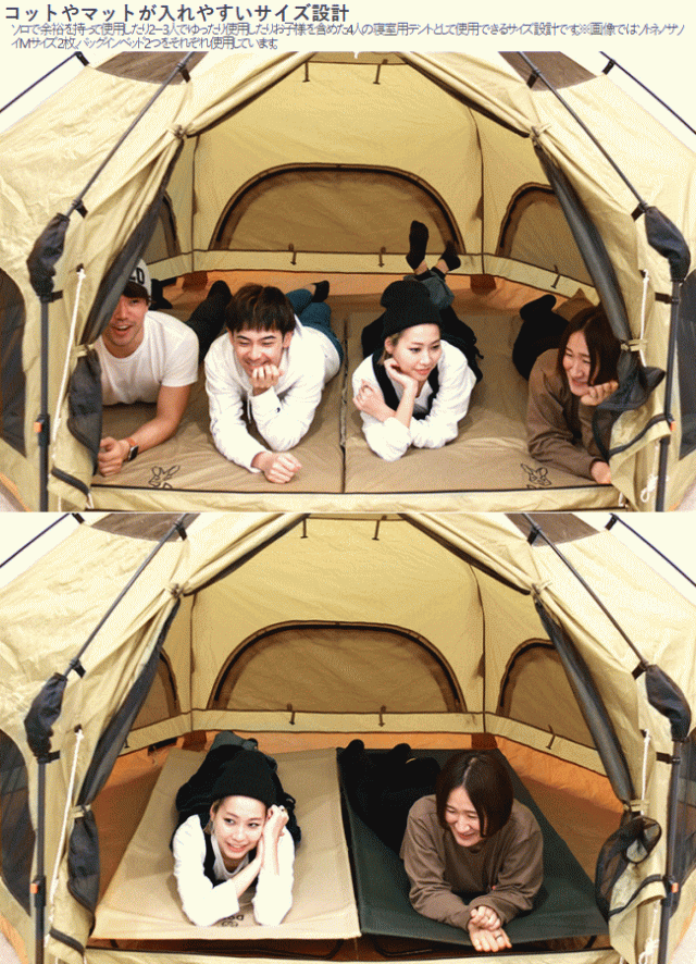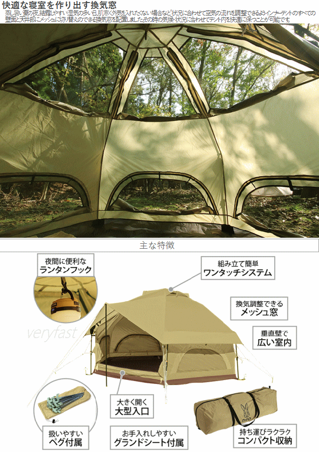 ![]() ニョキッとすぐにたつ快適なワンタッチ寝室用テント。 ワンタッチ構造を採用し取扱いやすさと快適性を追求した寝室用テント。扱いやすいコンパクトな床 面積ながら壁が垂直で快適性の高い構造を採用し圧迫感を感じにくい工夫を施しています。ソロで余 裕を持って使用したり2〜3人でゆったり使用したりお子様を含めた4人の寝室用テントとして使用で きるサイズ設計です。 ![]() ![]() ![]() ![]() ![]() ![]() |