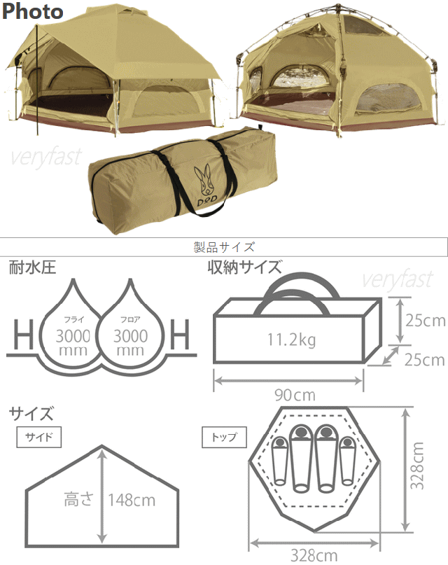 ニョキッとすぐにたつ快適なワンタッチ寝室用テント。ワンタッチ構造を採用し取扱いやすさと快適性を追求した寝室用テント。扱いやすいコンパクトな床面積ながら壁が垂直で快適性の高い構造を採用し圧迫感を感じにくい工夫を施しています。ソロで余裕を持って使用したり2〜3人でゆったり使用したりお子様を含めた4人の寝室用テントとして使用できるサイズ設計です。ワンタッチ構造を採用し組み立て・片付けが簡単にできます。テントの設営・片付けに時間をかけずにキャンプを楽しむことができます。■カラー:ベージュ■組立サイズ(外寸)約W328×D328×H168cm■インナーサイズ約W288×D248×H148cm■収納サイズ約W90×D25×H25cm■総重量約11.2kg■収容可能人数:大人2名、子供2名■最低耐水圧[フライシート]3000mm[フロア・グランドシート]3000mm■付属品:フライシート、グランドシート、フロントポール、ペグ、キャリーバッグ
