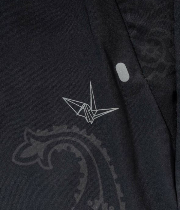 フロントとバックにリフレクタープリントを施し夜間の安全性も確保。左ももにブランドアイコン「折り鶴」や、ドローコードにも反射性能を備えています。