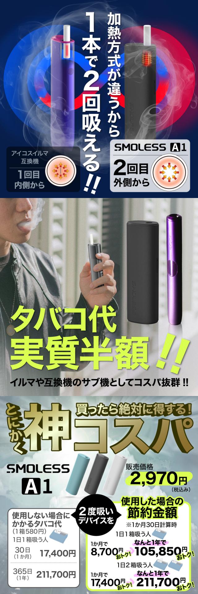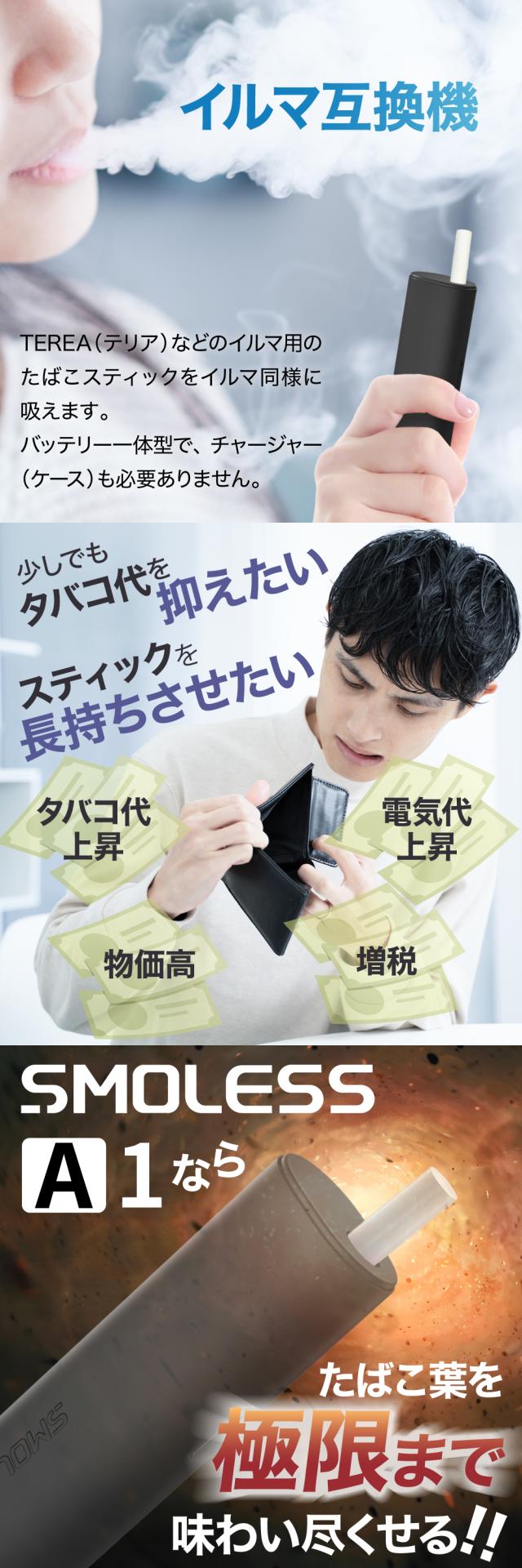 人気爆発中のアイコスイルマやアイコスイルマワンで吸い終えたシケモクを再利用できるアイコスイルマ互換機の 新ブランド ” SMOLESS ”(スモーレス)から、待望の新製品「SMOLESS A1」が新登場!