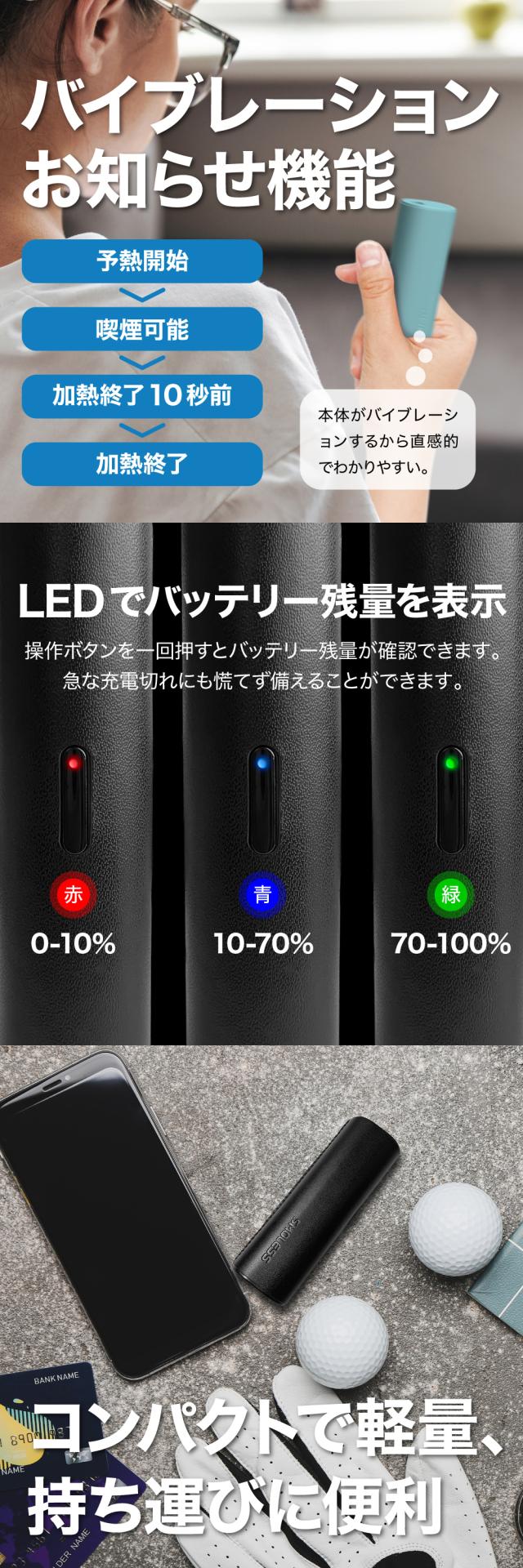 2000mAhのバッテリーを搭載しており、約20本程度の連続吸いが可能です。