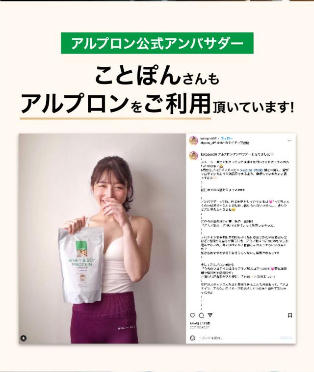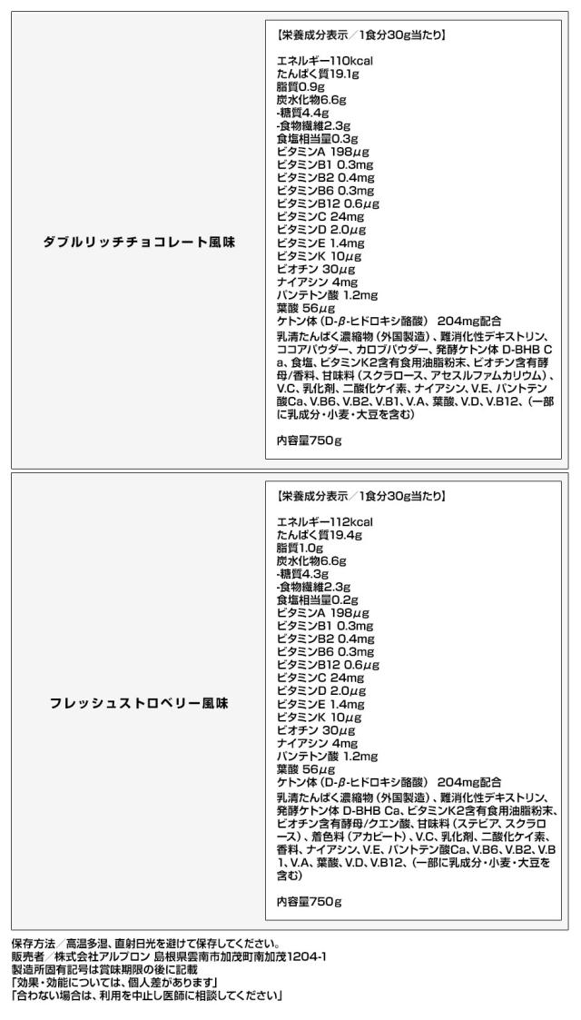 ※アルプロンでは、お客様に安定して商品をお届けするために 予告なく使用原材料を一部変更する場合がございます。 そのため、多少風味が変わる場合がございますが、 品質に問題はございませんのでご安心くださいませ。 原材料変更に伴い、栄養成分が変わる場合は 商品ページ栄養成分表、商品パッケージ裏面の栄養成分表も随時変更して参りますが ご注文のタイミングによって、栄養成分表が異なる場合がございます。 その際はお手元の商品パッケージ裏面の栄養成分表が 正確な数値となりますのでご確認頂きますようお願い申し上げます。 みなさまにより美味しい商品をお届け出来るよう アルプロン一同、日々努めてまいりますので 何卒ご理解賜りますようお願い申し上げます。