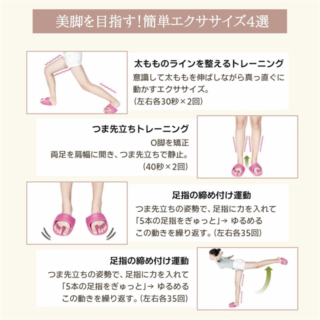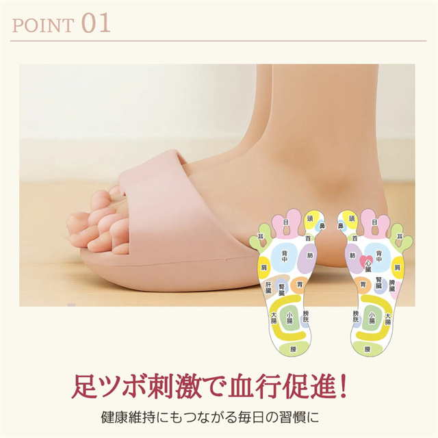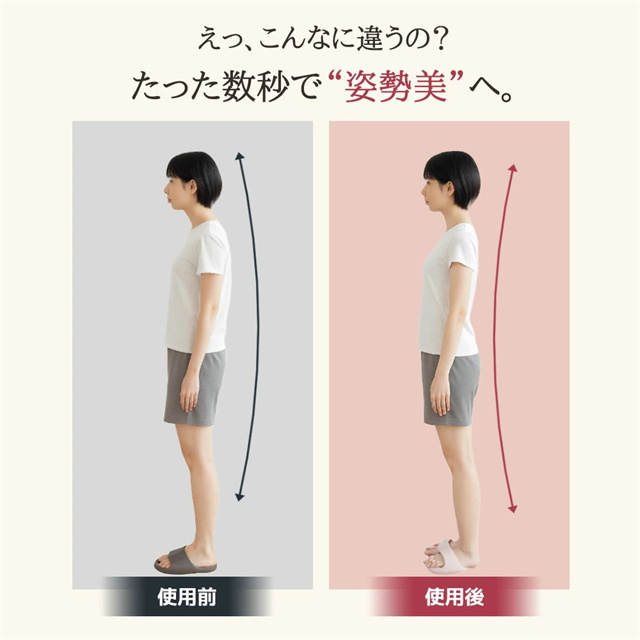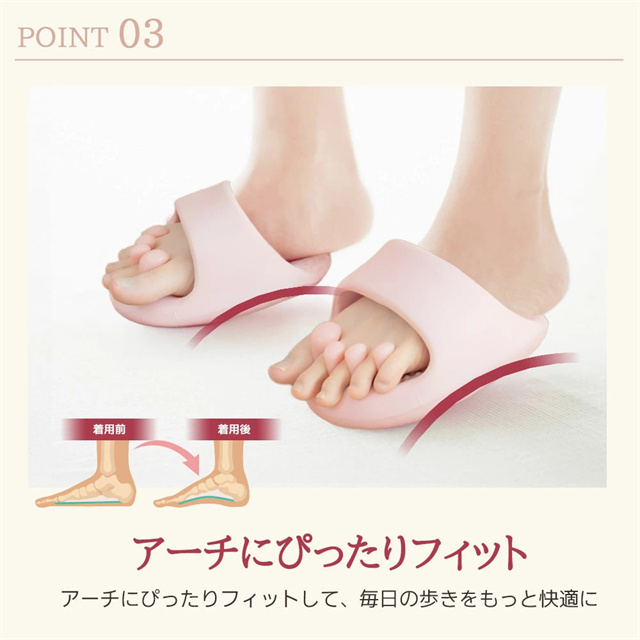 【履くだけで美脚ケア&巡りサポート】 特殊設計のインソールが足裏のツボを優しく刺激。歩くだけで巡りを整え、むくみを軽減。スッキリ引き締まった美脚ラインへ導きます。 【アーチサポートで自然な姿勢補正】 土踏まずをしっかり支える立体アーチが重心を安定させ、自然と正しい姿勢に。美しい立ち姿・歩き姿をサポートします。 【美しさと健康を同時にサポート】 履くだけで美脚・姿勢・健康の3方向からアプローチ。通勤や家事、オフィスでも、日常の一歩一歩がセルフケアに変わります。 【履くだけの簡単習慣】 忙しい毎日でも、特別な時間も場所も不要。ただ履くだけでケアができるから、無理なく続けられます。毎日の“ながら美容”に最適! 【リラックス効果で心も軽やかに】 足指ストレッチ×足裏刺激で、履いた瞬間からリフレッシュ。1日の疲れを癒し、心地よいリラックスタイムへ導きます。 |