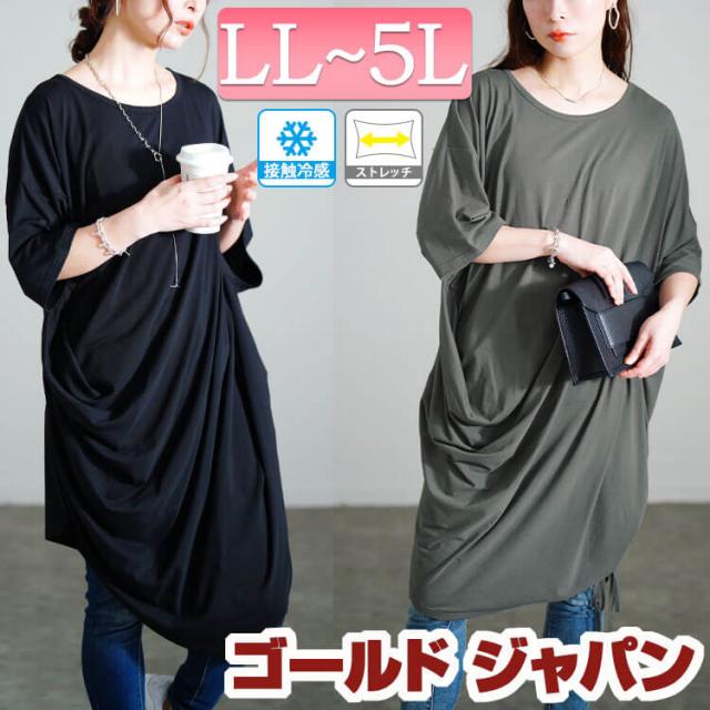 春新作 大きいサイズ レディース チュニック 接触冷感アシンメトリー変形チュニック ロング 5分袖 ドルマン 接触冷感 冷感 ストレッチ ドレープ ギャザー アシメ 変形 クルーネック 無地 ゆったり 春服 夏服 秋服 LL 2L 3L 4L 5L ブラック 黒 チャコール ゴールドジャパン
