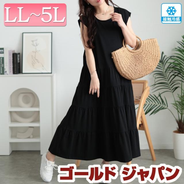 春新作 大きいサイズ レディース ワンピース 接触冷感ティアードワンピース ワンピ ロングワンピース ロング マキシ 接触冷感 半袖 ノースリーブ ティアード フレア Aライン クルーネック ストレッチ ゆったり 春服 夏服 秋服 LL 2L 3L 4L 5L ブラック 黒 ゴールドジャパン