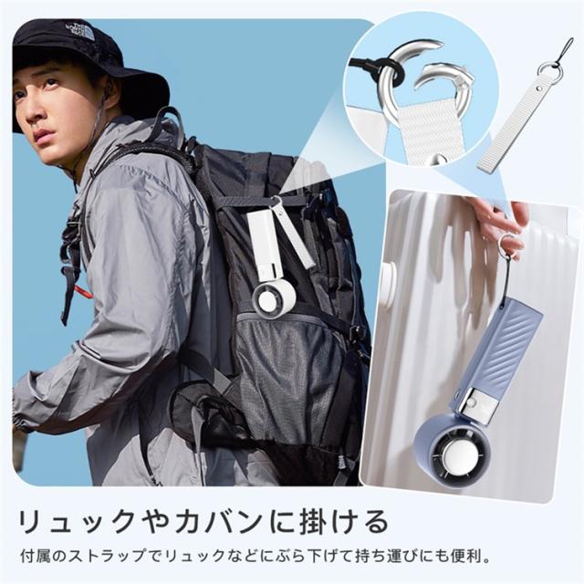 屋内外問わず使いやすいです。ハンディファンとして使えるのはもちろん、ストラップを付けて首に掛けて首かけ扇風機として使ったり、折り曲げてデスクに置いて卓上扇風機として使ったり、ボディ底部のカラビナを利用してバッグや服に取り付けて腰かけ扇風機にして涼んだりできます。