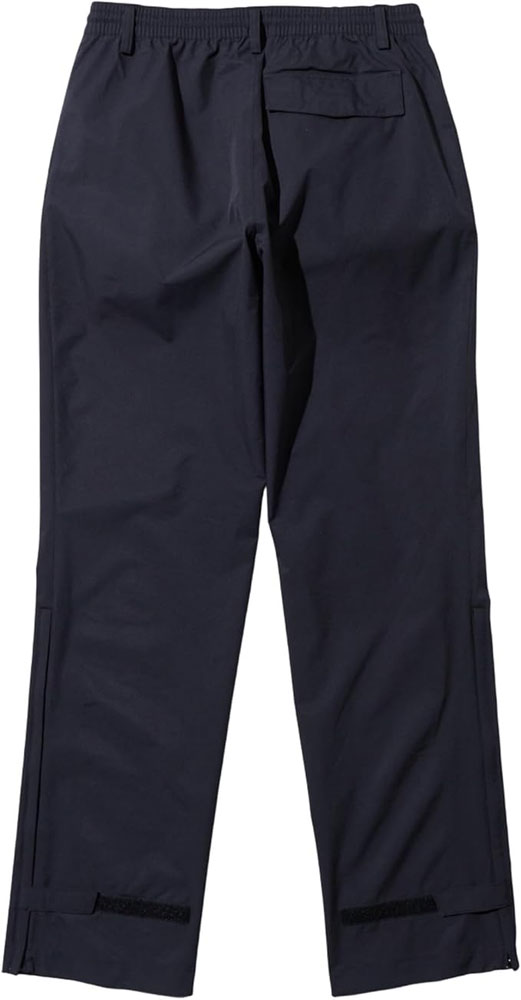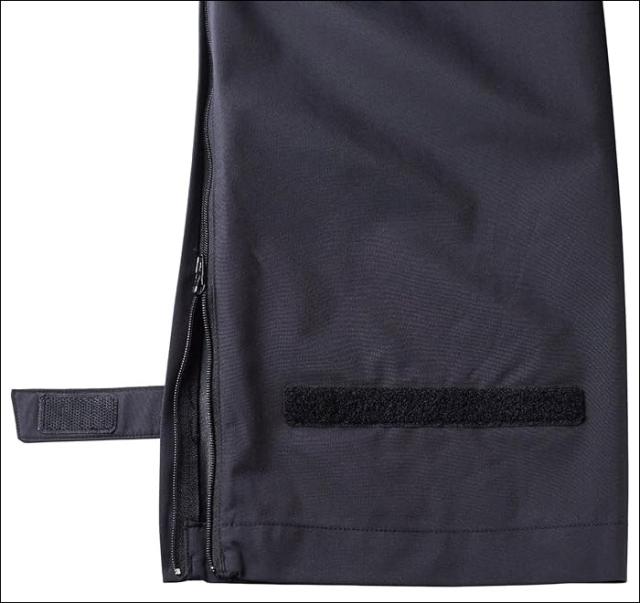 耐水圧15000mmの機能性素材を使用した簡易レインウェアは、ストレッチ性があり動きの中でも着用がしやすいです。雨が直接当たりやすい「首回り」「肩線」「アームホール」「股ぐり」の縫い目にはシームテープが施されており、雨の浸入を防ぎます。トップスは、背面のベンチレーションで衣服内の蒸れを軽減し、腰にはウエスト幅を調整できるテープが施されています。ボトムスは、インナーパンツのフロントポケットに直接アクセスできるスルーポケットが付き、裾には裾幅を調整できるテープが施されています。