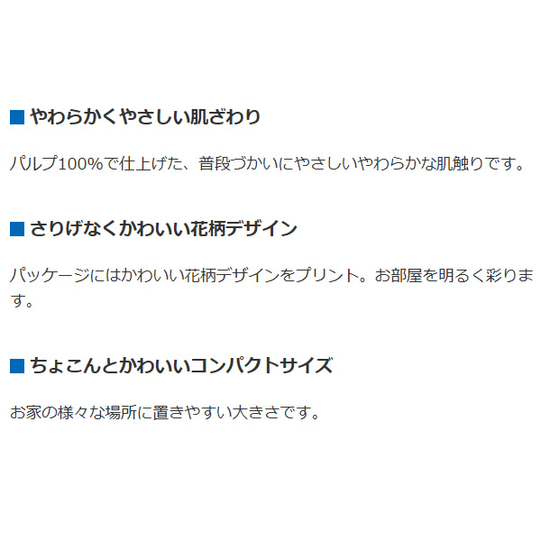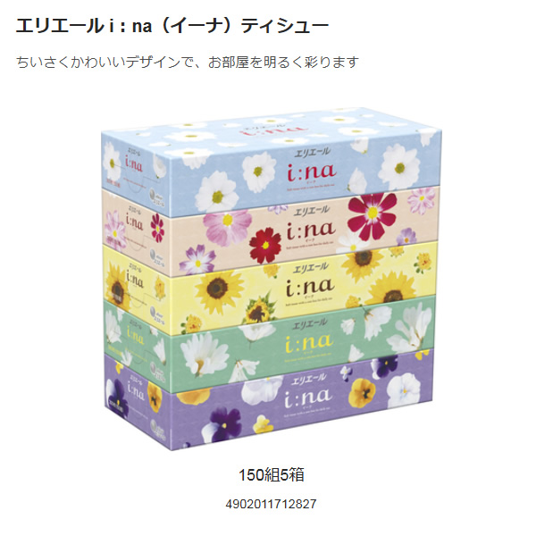 エリエール i:na(イーナ)ティシュー ちいさくかわいいデザインで、お部屋を明るく彩ります [150組/5箱] ■個装サイズ: 225×229×110mm (高さ×幅×奥行) ■枚数: ・300枚(150組) ■個装入数: ・150組×5 ■材質:パルプ100% ■原産国:日本 ※注意事項 ・ペーパーの色はホワイトです。 ・蛍光塗料は使用しておりません。 ・トイレの詰まりを防止するために、水洗トイレに流さないでください。 ・水ぬれにご注意ください。ティシューが取り出しにくくなることがあります。 ・においの強い物の側に保管すると、においが移ることがありますのでご注意ください。 ・取り出し口のフィルムをはがす時に底面のミシン目で手を傷つけないようにご注意ください。 ※記載は商品仕様の一部です。仕様説明不足等の理由での返品はできません。特に適合等は必ずご確認ください。