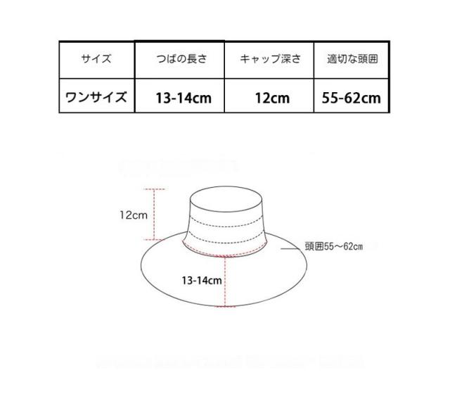 サイズ:頭周り約55〜62cm、つばの長さ約13cm、深さ約12cm