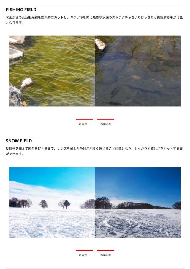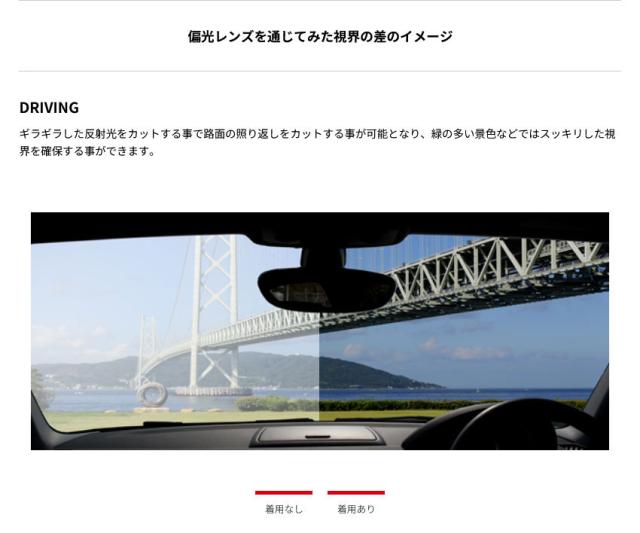 | レンズカラー説明 | 水面やアスファルト、芝生などのギラギラした反射光をカットする偏光レンズ。 ブラウン系レンズはブルーライトを抑える効果に加えて、自然な色調に近づける効果を併せ持ちます。 長時間の使用にも最適なレンズカラーです。 | 水面やアスファルト、芝生などのギラギラした反射光をカットする偏光レンズに加え、レンズ表面・裏面に反射防止コートを施して映り込みもカット。 すっきりとした視界を確保するレンズです。 |
