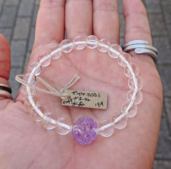 | 水晶:約8mm ガネーシャ:約14mm 水晶粒数:21 内径:約15cm 重さ:約20g |