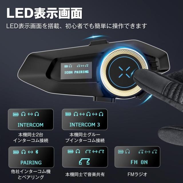 【2025最新バージョン】バイクインカムは最新のBluetooth5.3を搭載しております。速い接続速度、安定した出力と高い互換性を重ね備え、市販されている他のインカムより遥かに上回っています。また、バッテリー残量、インタコムモードなどが一目で分かるLEDディスプレイもこのインカムの特徴であり、個性と高いコスパを持ったハイスペックのモデルです。