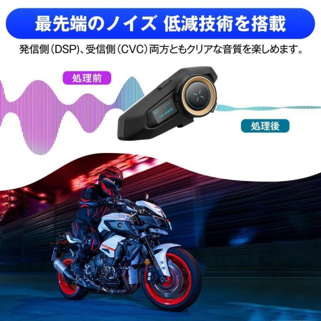 【多様な機能】新型バイク用インカムは様々な機能を備えています。従来のインカムの機能だけではなく、自動着信応答、音声アシスタント、音楽共有とFMラジオなどの機能も搭載しております。DSP/CVCノイズ低減技術により、周囲の騒音を大幅に低減させるだけでなく、クリアな音声を取り込み、通話双方に高音質な音声を届けることができます。
