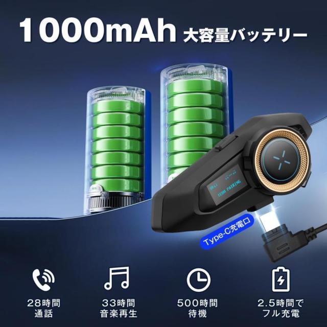 【長い連続使用時間】バイクインカムは1000mAh大容量電池を内蔵し、連続インターコム通話時間最大28時間、連続音楽再生時間最大33時間に達します。
