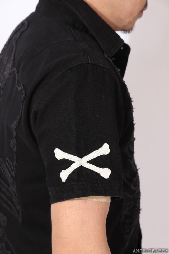 左胸にオーバルロゴのレザーワッペン・両袖にはクロスボーンのレザー叩き付け!!