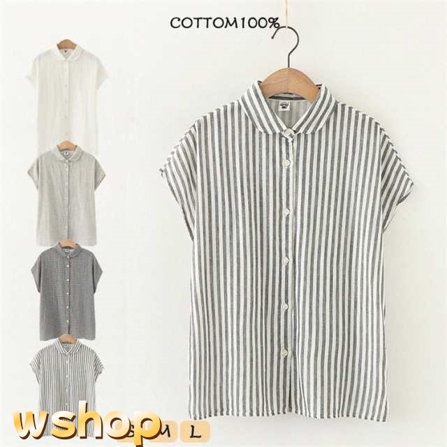 シャツ ブラウス フレンチスリーブ トップス レディース 女性用 ガーゼ ノースリーブ 綿100% コットン100% コットン リネンコットン ナチュラル ラウンドカラー 丸襟 襟 前開き 抗菌 無地 チェック ストライプ 白 ホワイト グレー コーデ 30代 40代 50代 母の日 プレゼント 春 夏 ファッション ytolive ウイトライプ